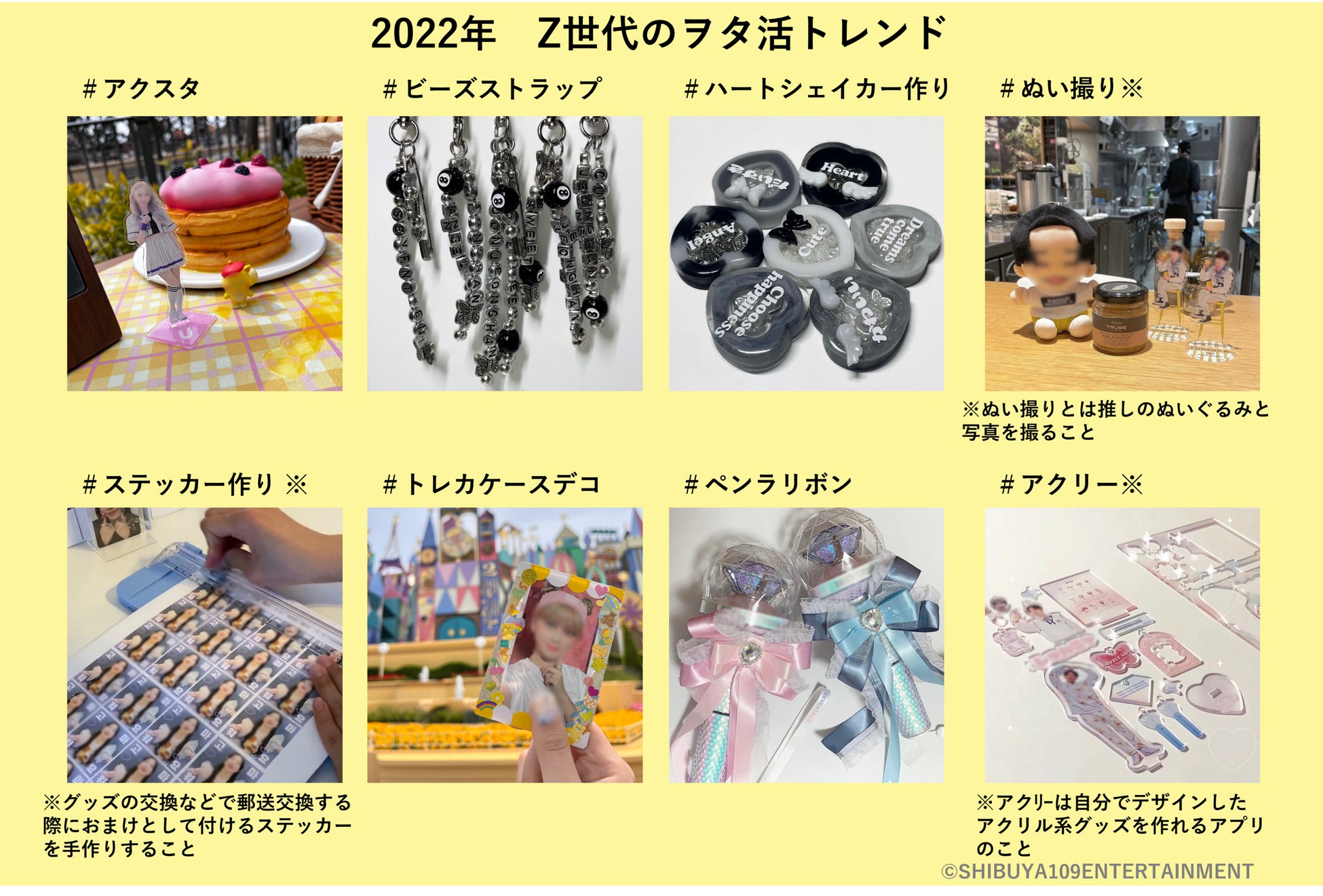 また、2022年のヲタ活は外出規制緩和に伴い「推しとお出かけすること」がトレンドです。推しのアクスタ(※アクリルスタンド)やトレカ(※トレーディングカード)、ぬい(※ぬいぐるみ)を日常的に持ち歩き、カフェなどで撮影しており、それらを「推しを連れていく」と捉えているようです。それだけでなく、昨年流行したグッズを自分なりにデコレーションする「創作ヲタ活」の流れも続いています。