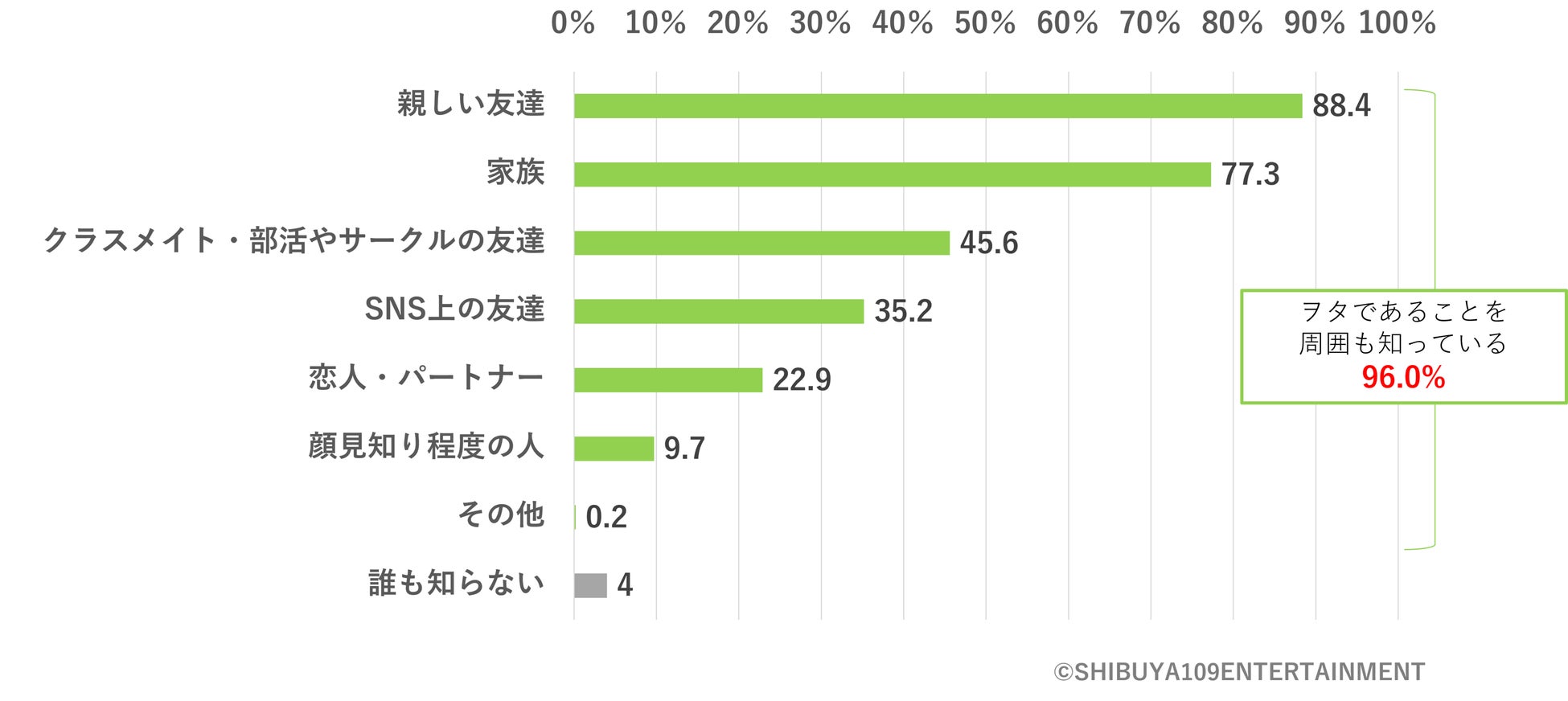 次に、ヲタ活に関するコミュニケーションについて見てみると、ヲタ活をしているZ世代のうち、96.0%が自分がヲタクであることを周囲に知らせている※図12ことがわかっています。一方、知らせている相手については「親しい友達(88.4%)」や「家族(77.3%)」が高い数値となり、「クラスメイト・部活やサークルの友達(45.6%)」「恋人・パートナー(22.9%)」の数値と差が出ていることから、全員に漏れなくヲタクであることをアピールしているのではなく、あくまでヲタ活について話す相手は絞り「ヲタ活安全圏」の中でコミュニケーションをとっていることが考えられます。