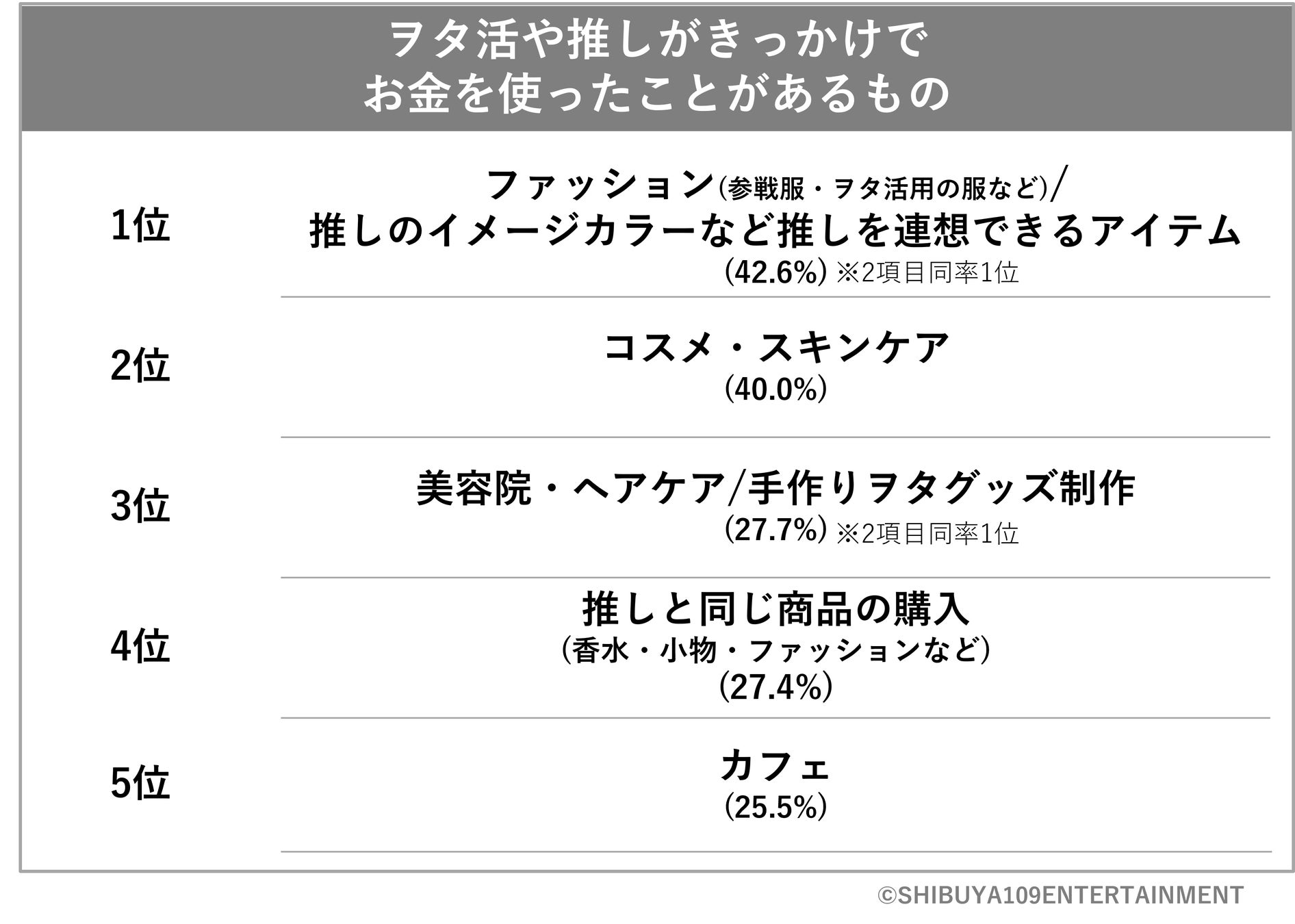 その中身として挙げられたのは、「参戦服(ライブなど、ヲタ活する際に着る服)(42.6%)」、「推しのイメージカラーなど推しを連想できるアイテム(42.6%)」、「コスメ・スキンケア(40.0%)」など。