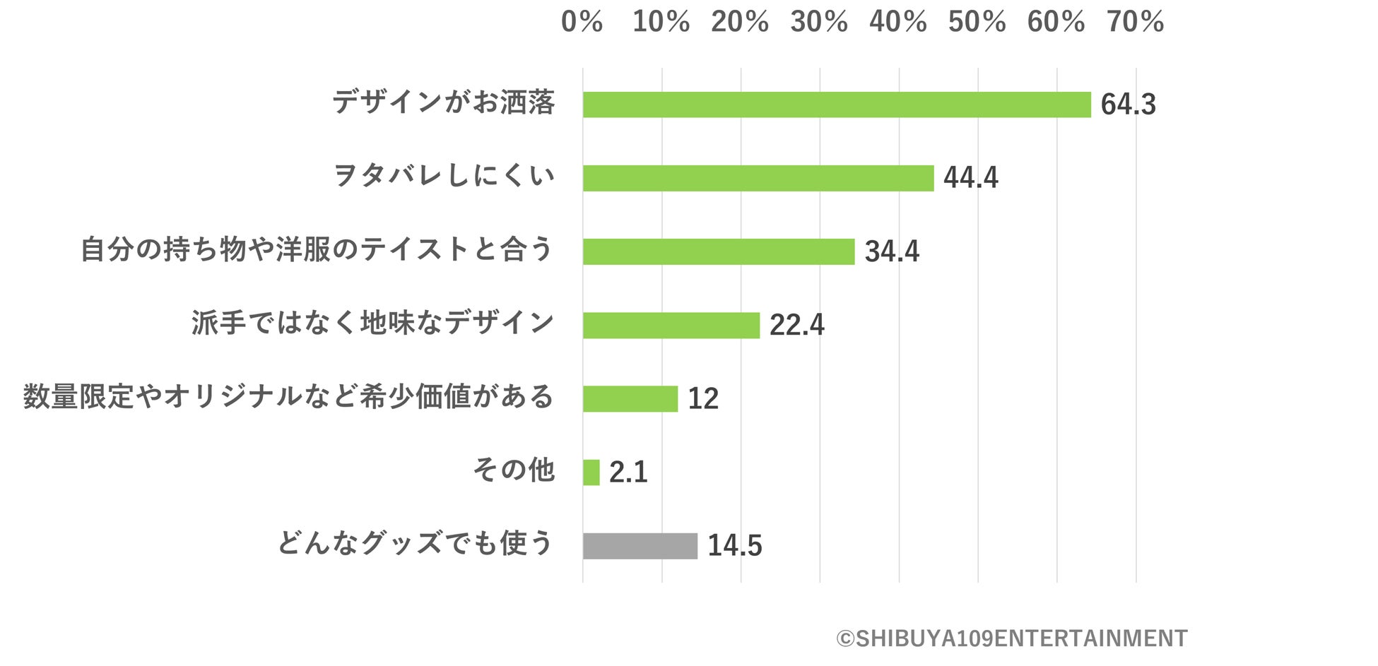 「公式グッズを日常生活でも使用している」Z世代は約57.0%で半数を超えますが※図10、公式グッズにおいては、「どんなグッズでも買う」と回答したのは1割程度※図11になり、重要視されているのは、「デザインがお洒落(64.3%)」「ヲタバレしにくい(44.4%)」「自分の持ち物や洋服のテイストと合う(34.4%)」で、普段から使用できるアイテムが求められていることがわかります。グループインタビューでも「去年の推しのライブTシャツが、ロゴも小さく、デザインもとてもお洒落だったのでよかった。ライブTシャツに見えないようなものだったので私服でも着ていた」といった声がありました。