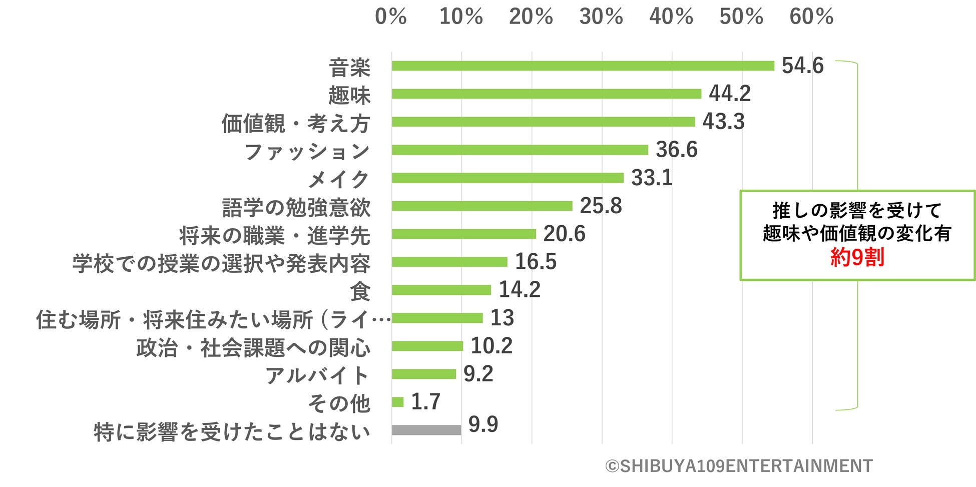 さらに、「推しの影響を受けて趣味や価値観の変化があった」と回答※図7した人は9割にものぼり、「音楽(54.6%)」「趣味(44.2%)」「価値観・考え方(43.3%)」などで影響を受けていることがわかります。