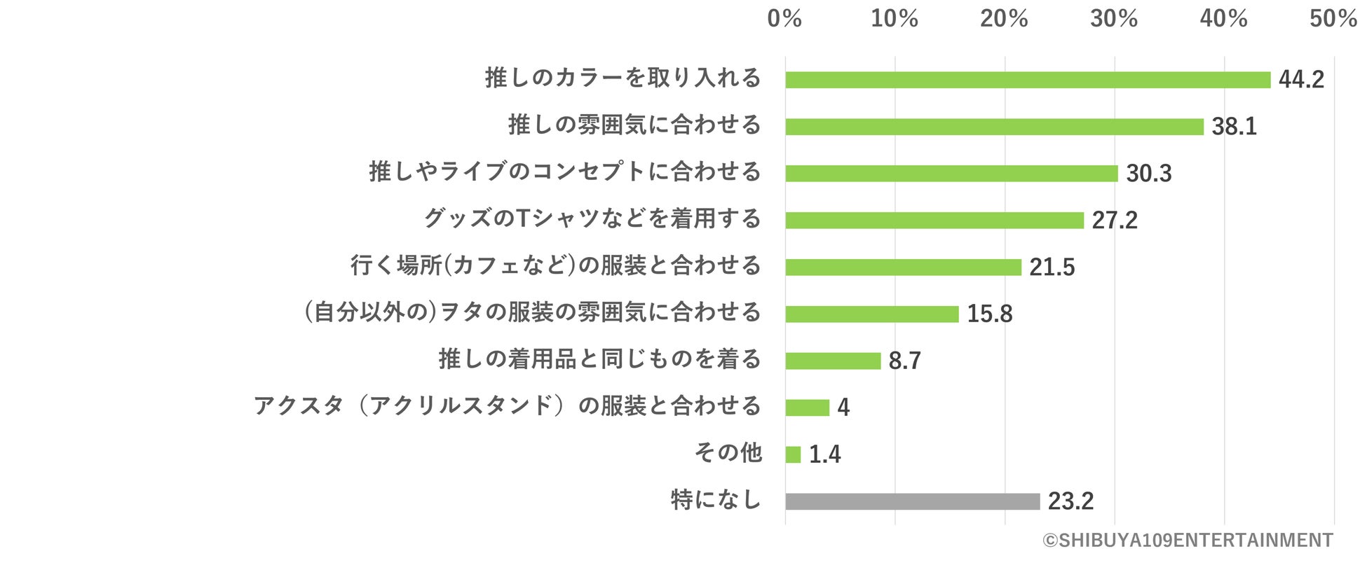 さらに、ヲタ活の際に「推しのカラーを取り入れる(44.2%)」「推しの雰囲気に合わせる(38.1%)」ファッションをした経験があるという回答※図9が、「グッズのTシャツなどを着用する(27.2%)」という回答を上回り、ヲタグッズをそのまま着るのではなく、あくまで自分が普段着ている服装に合わせて ヲタ活要素を取り入れていることがわかります。