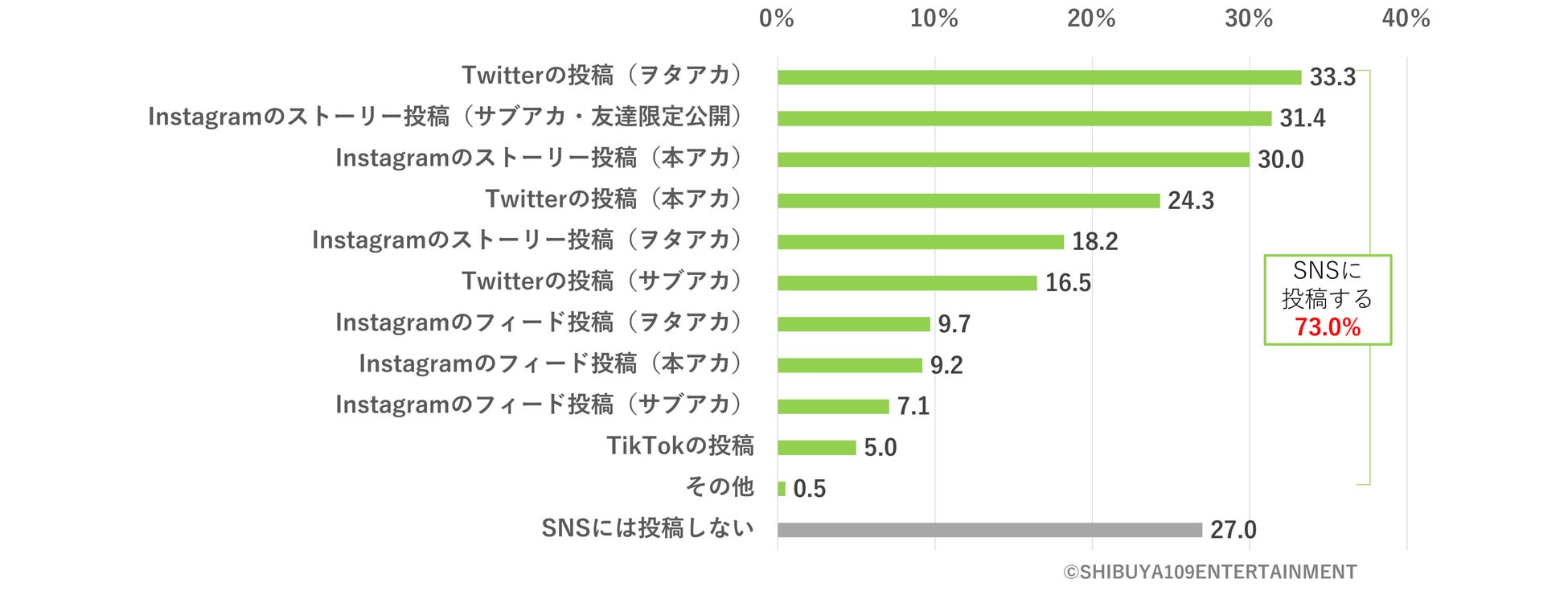 さらに、ヲタ活をどのSNSアカウントで投稿しているか※図13聞いてみると「Twitterの投稿(ヲタアカ)(33.3%)」「Instagramのストーリー投稿(サブアカ・友達限定公開)(31.4%)」「Instagramのストーリー投稿(本アカ)(30.0%)」という回答が多数になり、不特定多数が閲覧するSNS発信においても、「ヲタ活アカウント」や、Instagramの「親しい友達機能」を活用して、発信を見られる相手を絞り、日常生活とヲタ活を切りわけた「ヲタ活安全圏」をつくって発信していることがわかります。