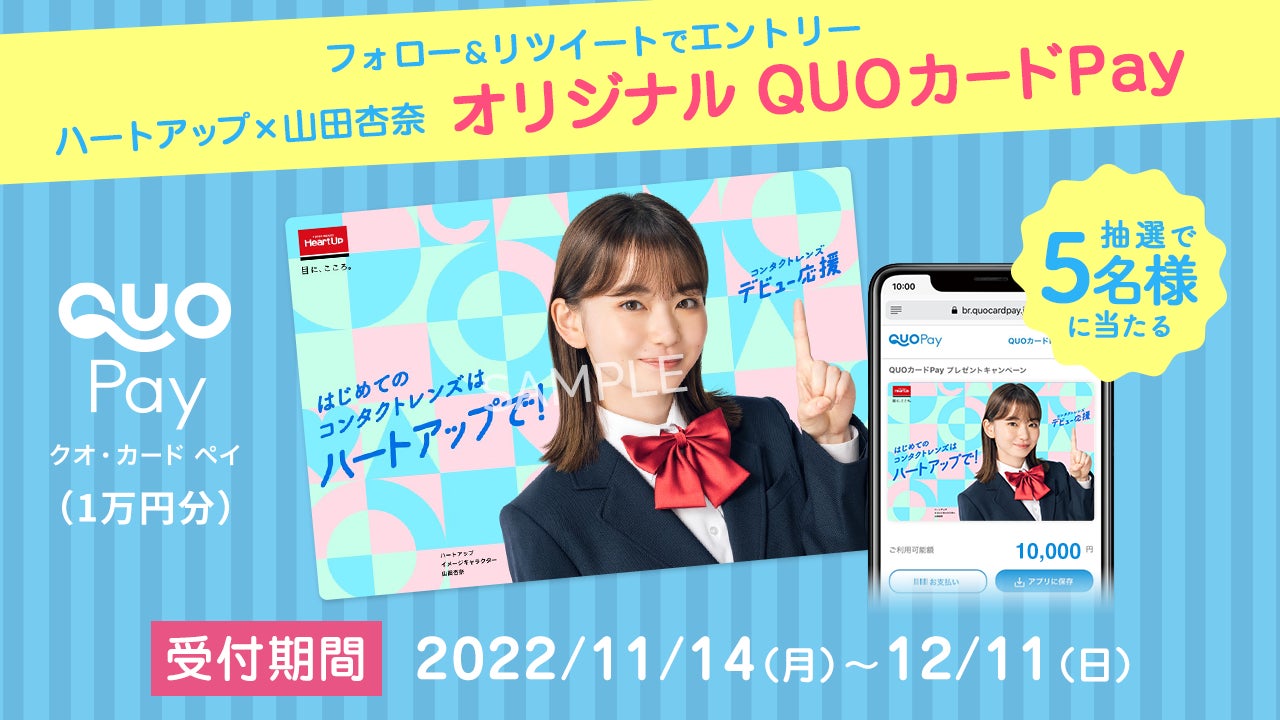 また、山田杏奈のイメージキャラクター就任を記念して2022年10月20日から2022年12月31日までの期間にはじめてハートアップでコンタクトレンズを購入した方に先着8,000名様に、ハートアップ×山田杏奈限定クリアファイルをプレゼントする企画や、2022年11月14日(月)から2022年12月11日の期間にハートアップ公式Twitterアカウントで限定デザインのQUOカードpayのプレゼントキャンペーンを実施する。