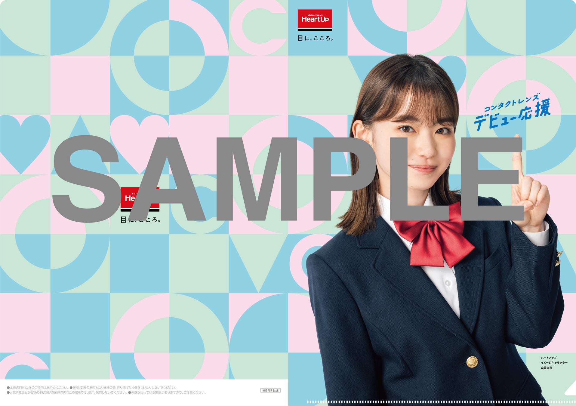 対象期間中にはじめてハートアップでコンタクトレンズを購入した方に先着8,000名様に、コンタクトレンズデビュー応援キービジュアルを使用した、ハートアップ×山田杏奈限定クリアファイルをプレゼント。
