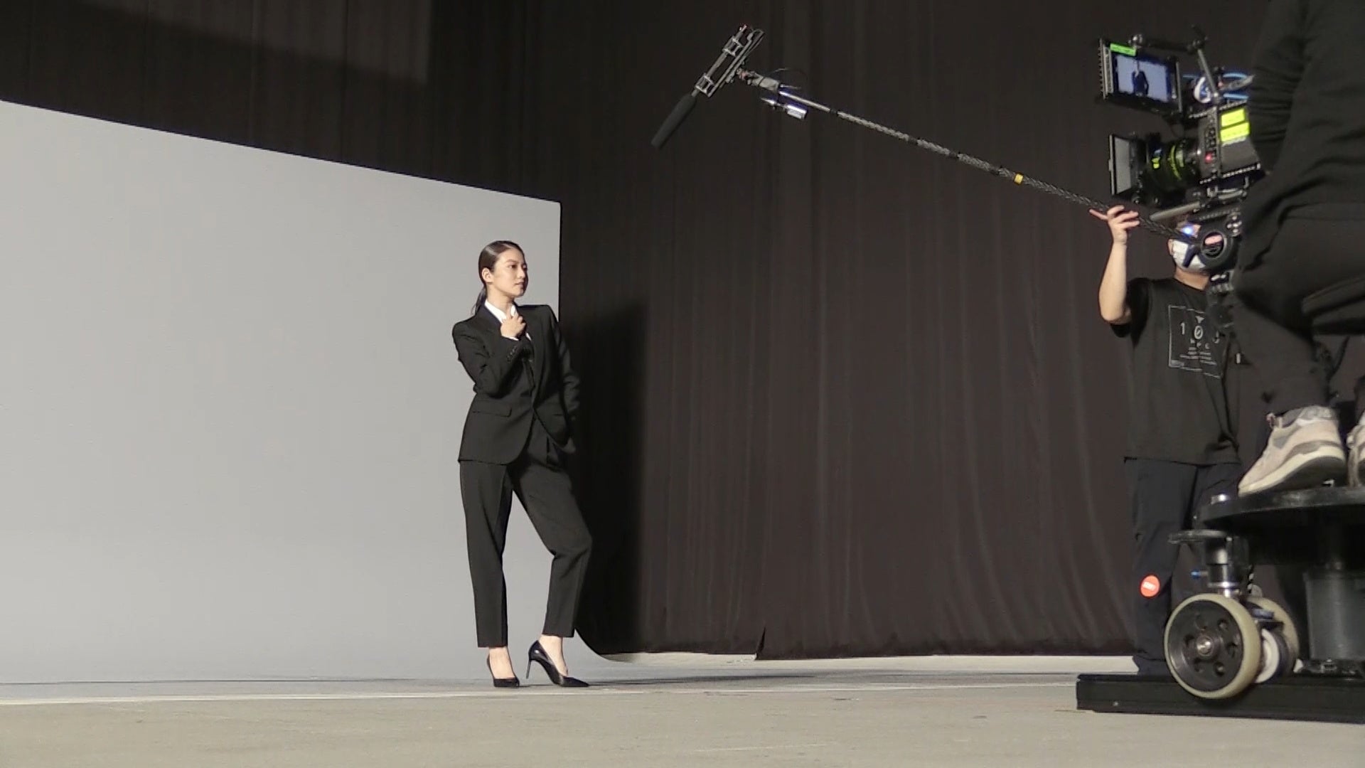 笑顔でスタジオ入りし、真剣な表情でスタッフから説明を聞く、マニッシュなスーツ姿の今田。クールなウォーキングを披露するとあって、先生から入念な指導を受け、真剣な表情で動きやポーズの確認をしていた。