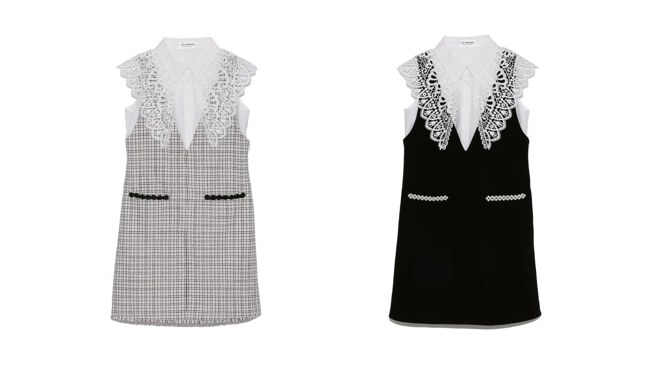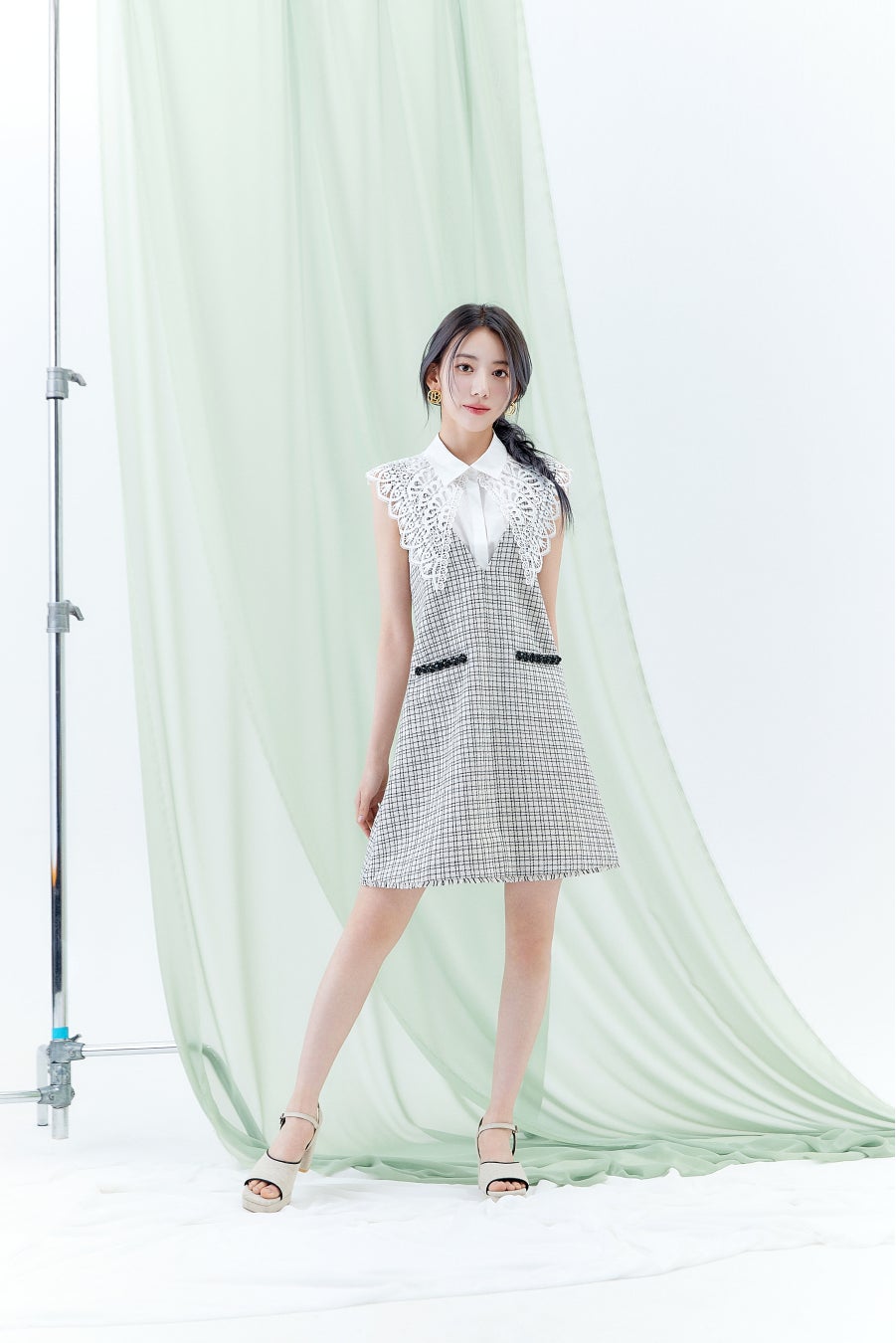 レース装飾が印象的なノースリーブシャツと今年らしいミニワンピースのセットアイテム。シャツはヴィンテージ感のあるレースを大胆にあしらい華やかな印象に、ワンピースはAラインのミニ丈でトレンドライクなデザインに仕立てています。