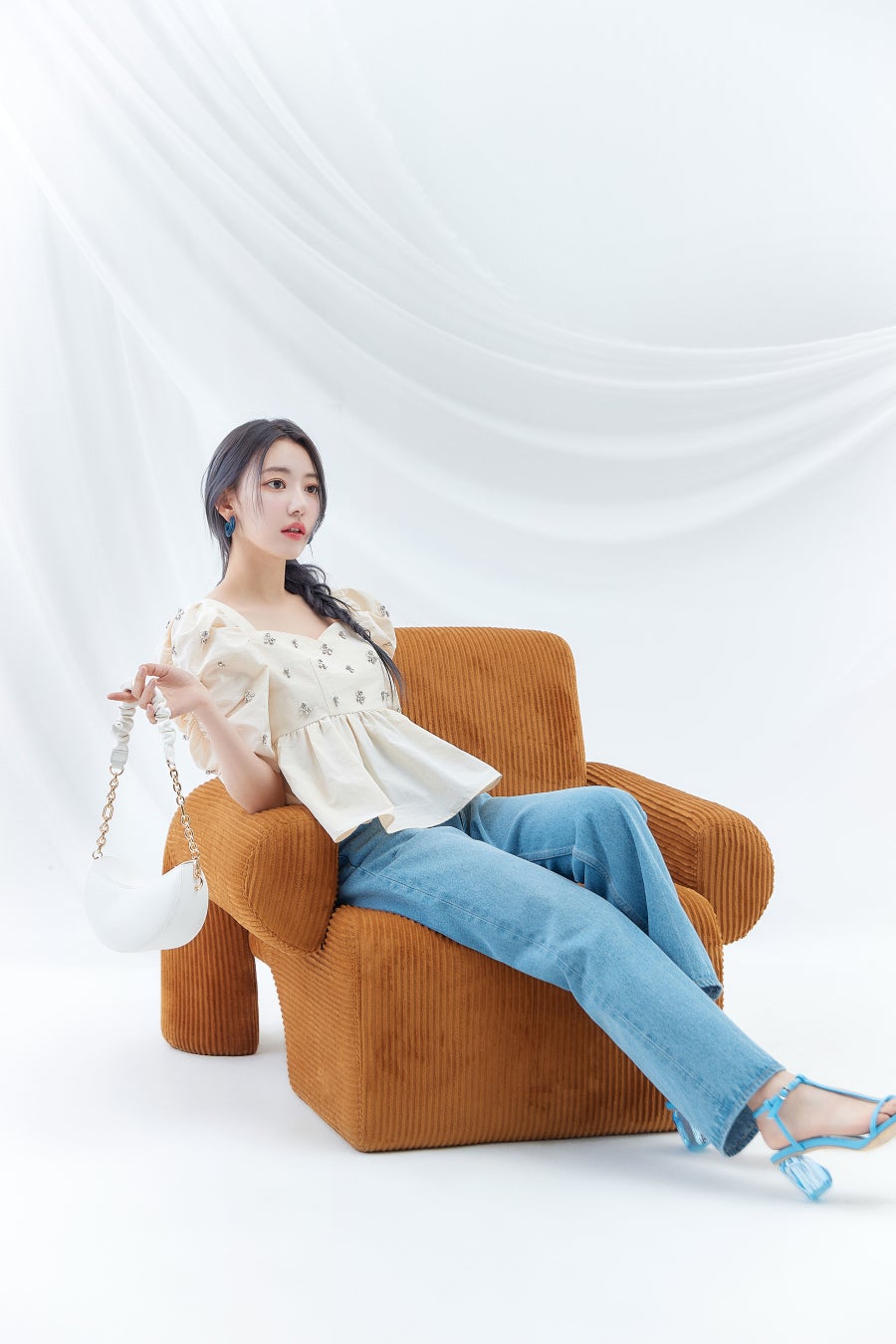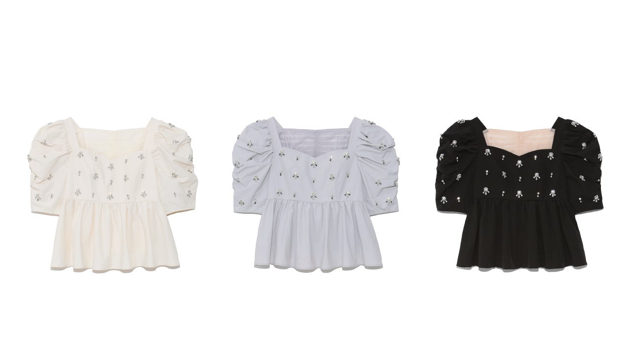 パールとビジューを贅沢にあしらい、背中部分をチュールでの切り替えにして程よい肌見せを演出するなど、レディムード溢れるトップスをデニムと合わせてカジュアルダウンしたコーディネート。
