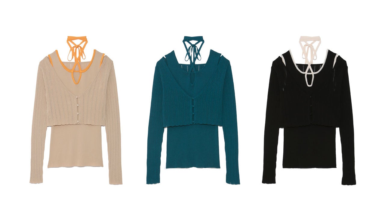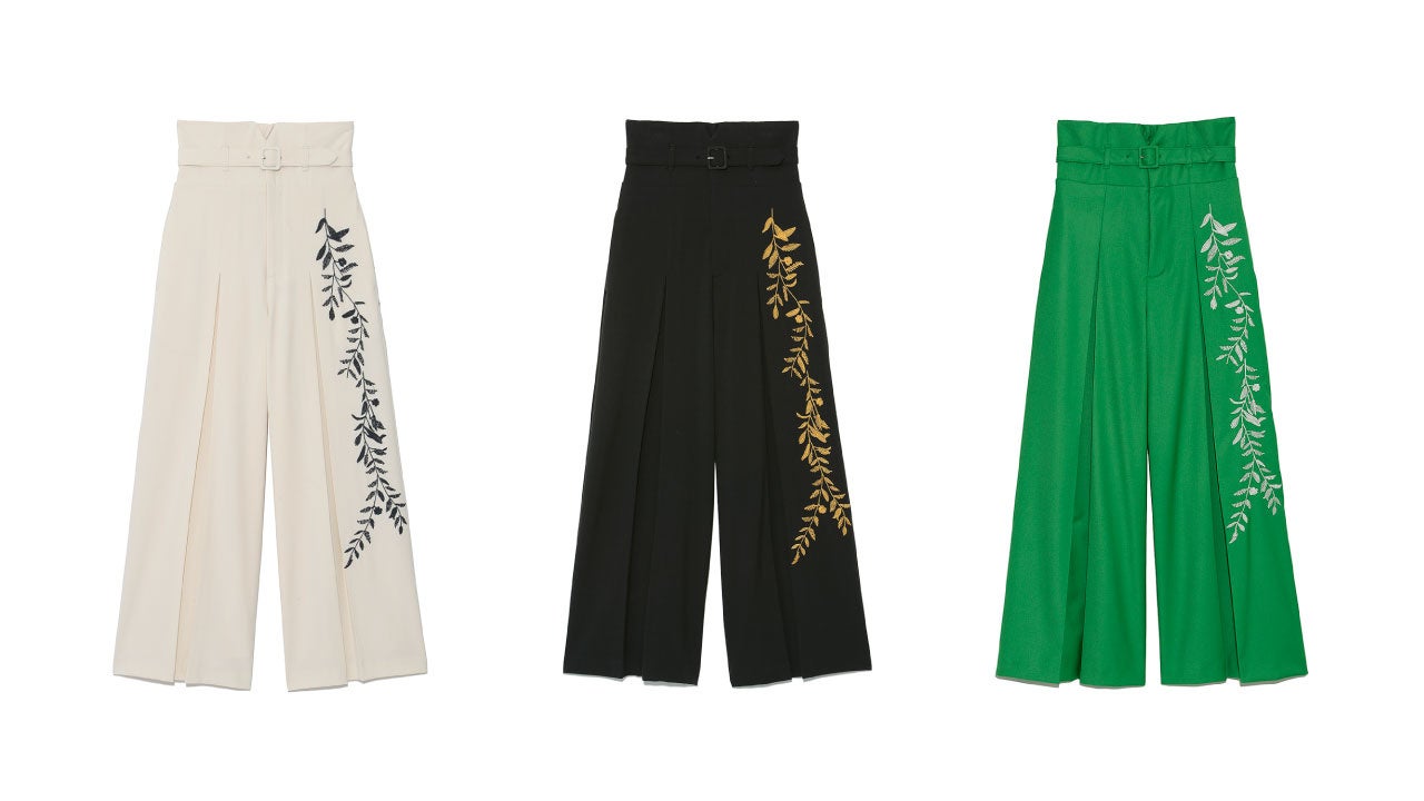 コンパクトなショート丈カーディガンと、大胆なオリジナル刺繍が目を引くハイウエストパンツのコーディネートは全身のバランスが計算されたスタイリング。カーディガンはオフショルダーで着こなせば、ヘルシーな肌見せも叶います。