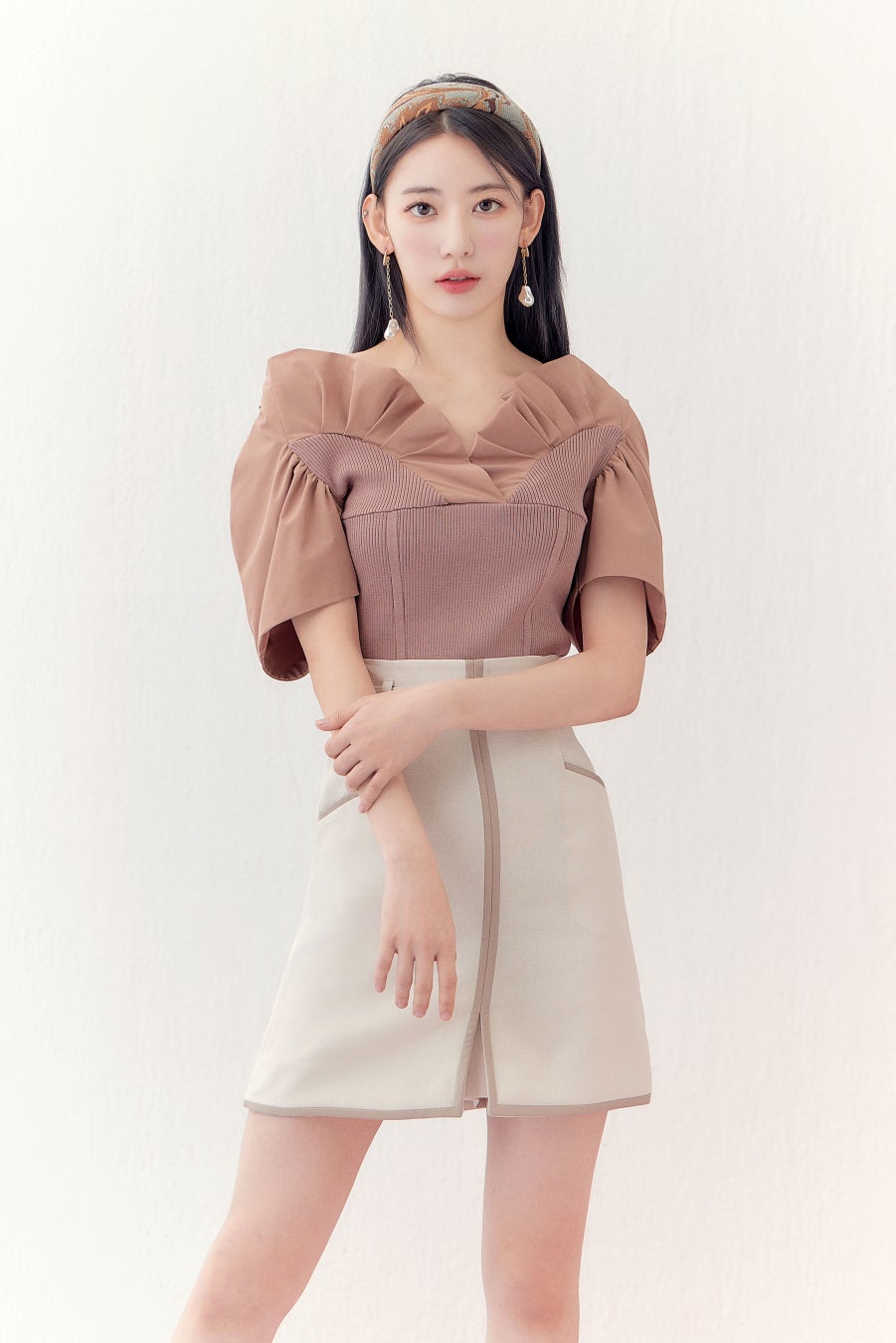 ネックラインにあしらった立体的なフリルデザインが華やかなトップスは、パイピングディテールが施されたタイトなボトムスを合わせて、女性らしさの中にもスパイスの効いた都会的なコーディネートが完成します。