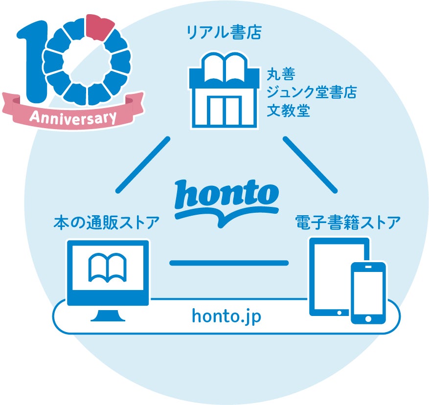 「honto」は、ネット書店(本の通販ストア、電子書籍ストア)と、丸善、ジュンク堂書店、文教堂などのリアル書店を連携させた総合書店として2012年5月にサービスを開始し、2022年5月でサービス開始から10周年を迎えました。