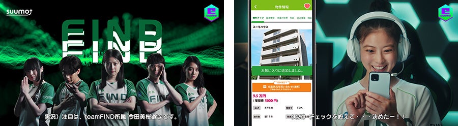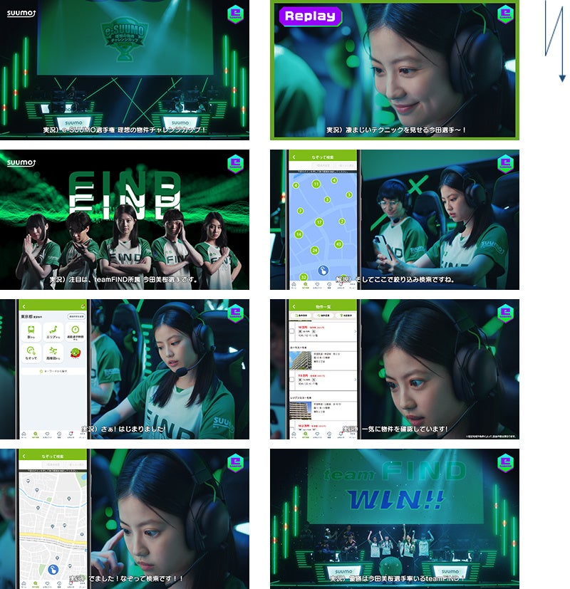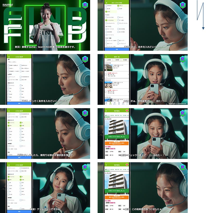 今回のCMでは、e-スポーツチームのteamFINDの一員として『SUUMO』で住まい探しを競うe-SUUMO選手権に挑戦する今田。リアル大会篇ではいかに理想の物件を見つけられるかを競う。ユニフォームに身を包んだ今田はやる気満々の様子。大会がスタートすると華麗な指さばきで地図をなぞって物件を探せる”なぞって検索”を駆使し、理想の物件を見つける。
