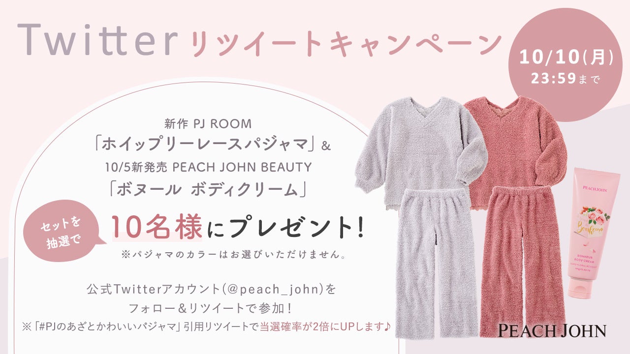9月28日(水)正午より、PEACH JOHN公式Twitterにて、リツイートキャンペーンを実施します。抽選で10名様に、PJ ROOM新作「ホイップリーレースパジャマ」と、10月5日(水)発売予定のPEACH JOHN BEAUTY「ボヌール ボディクリーム」をセットでプレゼント!