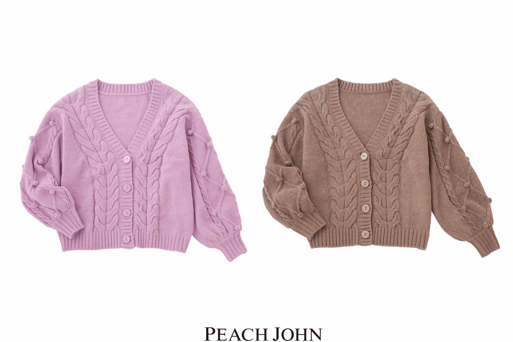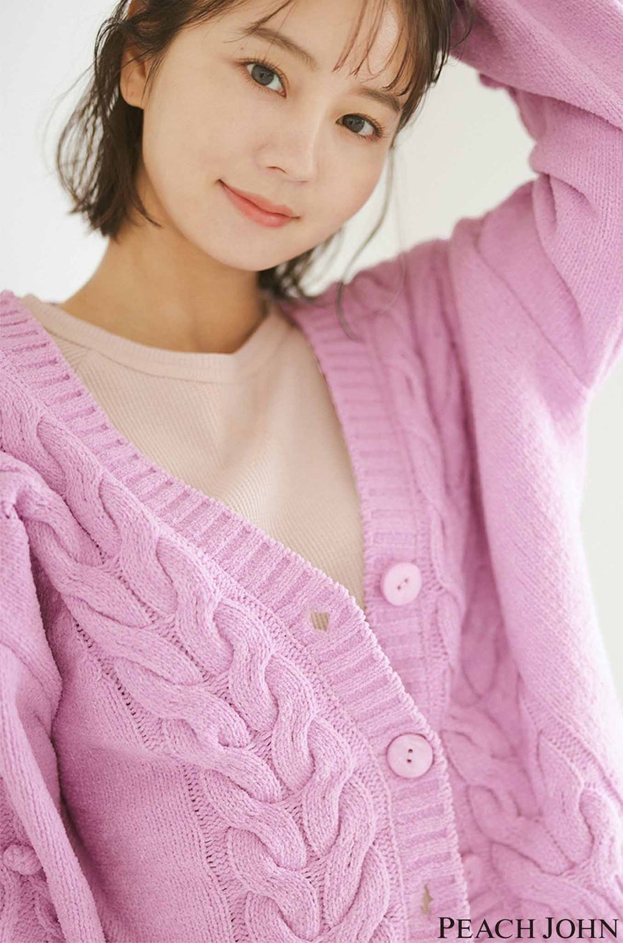 ケーブル編みの模様と袖部分のポップコーンがポイントのホイップリーカーディガン。カジュアルにも、フェミニンな雰囲気にも着用できるアウターライクな羽織物です。パッと気分が明るくなる華やかなピンクと、カジュアルなブラウンの2色展開。