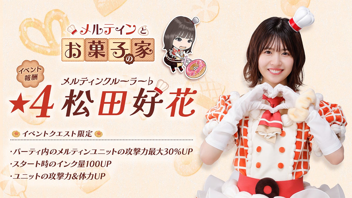 「★4メルティンクルーラー♭ 松田好花」はパーティ内の『メルティン』ユニットを強化するイベント効果持ち!ぜひゲットしてイベントを有利に進めましょう!