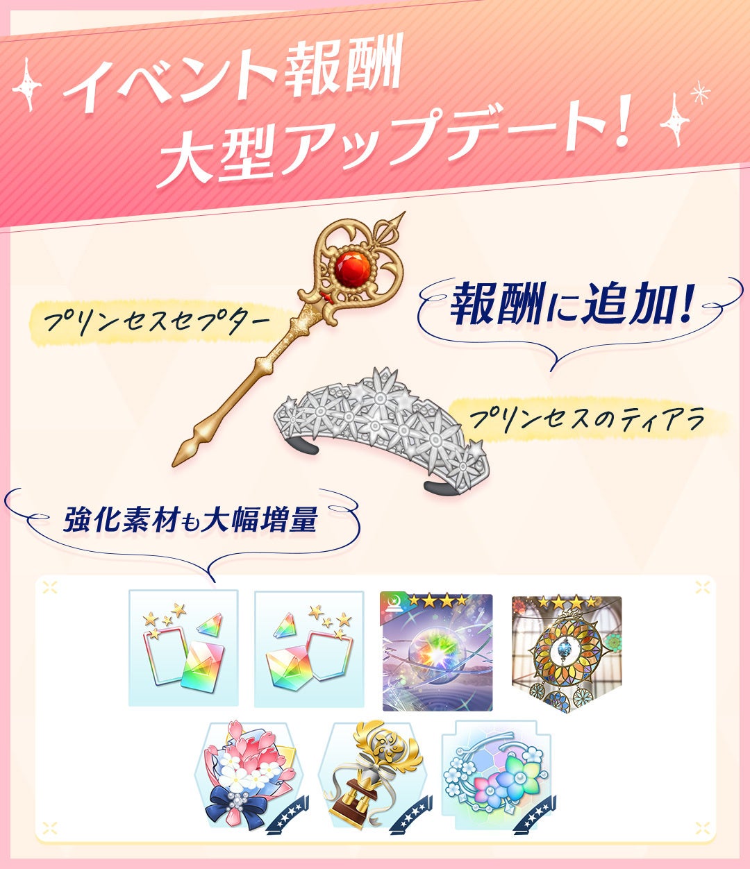 今回のイベントでは、プリンセスのメンバーカードを覚醒する「プリンセスのティアラ」やビブリアアーツ強化アイテム「プリンセスセプター」や、★4メンバーカードを出撃加速する「★4加速カード」や★4おまもりを加護錬成する「★4錬成おまもり」をはじめとした強化素材が大幅に増量!
