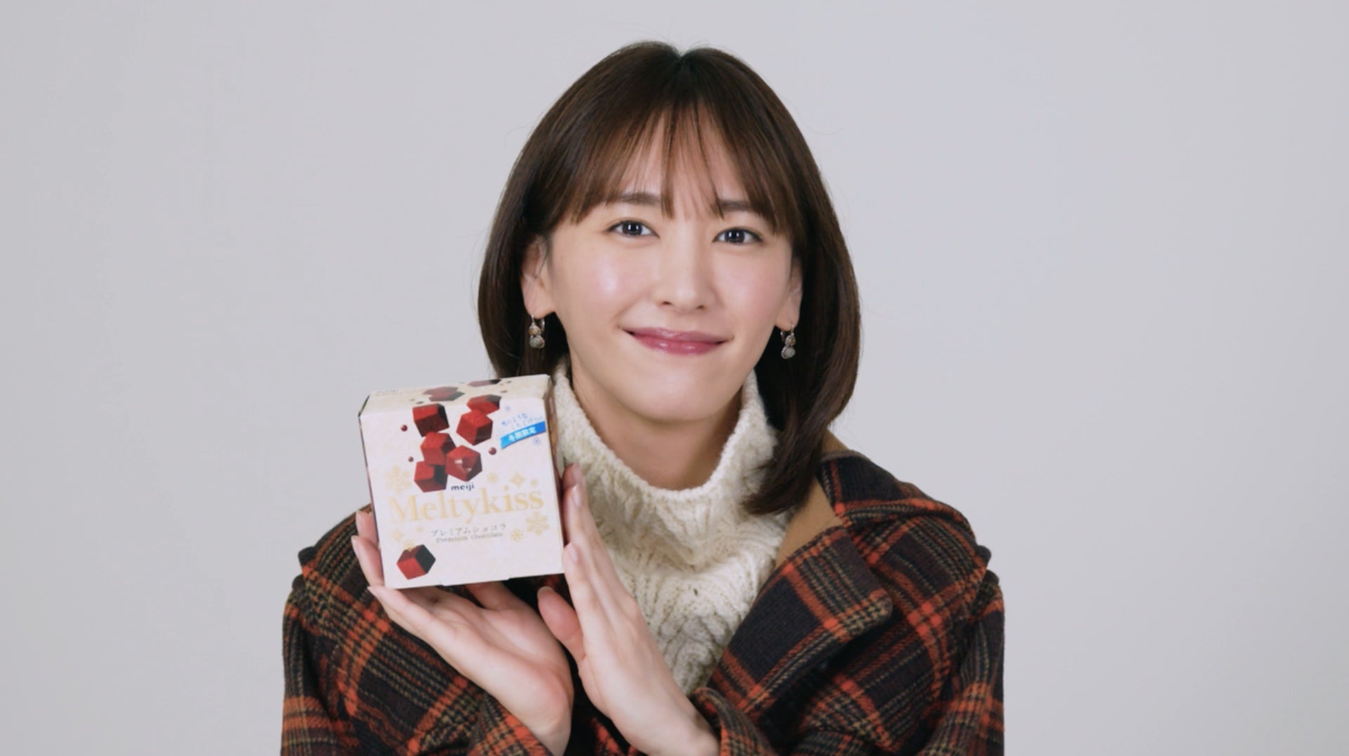 「こんにちは、新垣結衣です。北海道の皆さんに、なまらおいしい雪のようなくちどけ、メルティーキッスを一足早くお届け!したっけ、コート着て、チョコレート買いに行こ?一緒に食べるべ。明治♪メルティキッス♪」