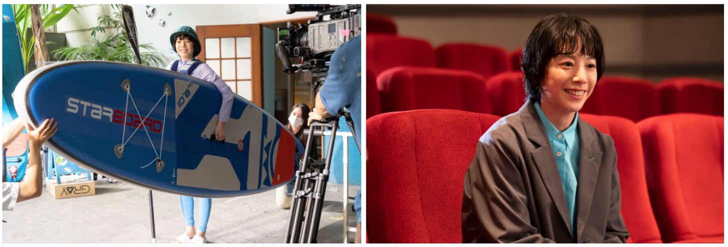 オフィスシーンから映画館へ、はたまたオフィスのドアを開けばSUPヘとテンポよく場面が切り替わるのだが、シチュエーションごとにカウントを取りながら次の場面とタイミングを合わせて撮影がおこなわれた。たとえばパソコンを閉じるのを合図に椅子に座りながら勢いよく一回転!そのまま自宅のリビングへと場面が切り替わるという具合。回るタイミングや姿勢がブレないように保つのがとても難しいのだが、夏帆はあっという間にコツをつかみ、すぐさま成功! モニターをチェックしながら、何度もタイミングを細かくチェックしていた。