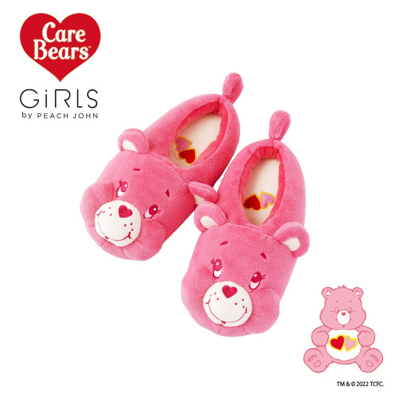 「ラブアロットベア™」のぷっくりしたほっぺや耳、しっぽまで再現した、まるでぬいぐるみのようなスリッパ。表地は毛足短めのファーで、内側はソフトなベロアタッチのサンゴマイヤー生地を採用。足の甲をすっぽり包み込んで冷えやすい足元をあたたかく守ります。「ケアベアふわもこカーデセットアップ」とのコーディネートがオススメ。