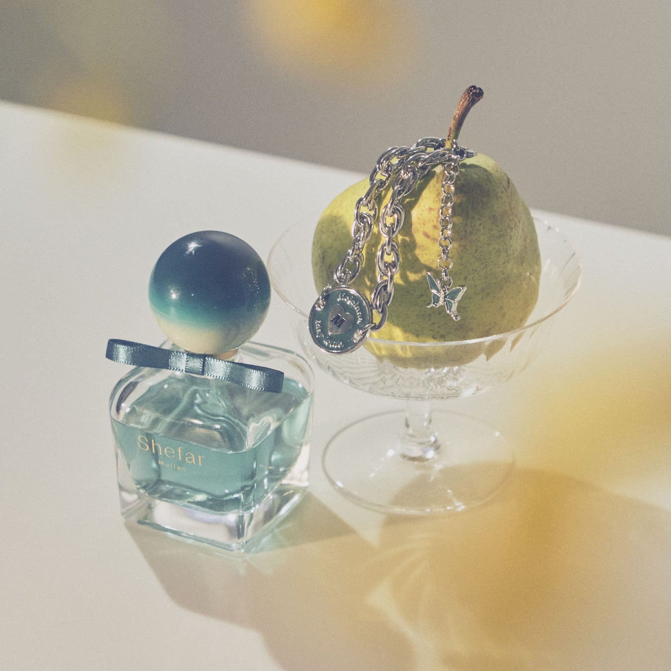 Mullanのモチーフでもある蝶を取り込んだ、香水と同様ユニセックスでお楽しみいただけるブレスレット。着用した際に、蝶が自由に彷徨っているかのように揺れるのが特徴です。長さも自由にご調整いただけます。