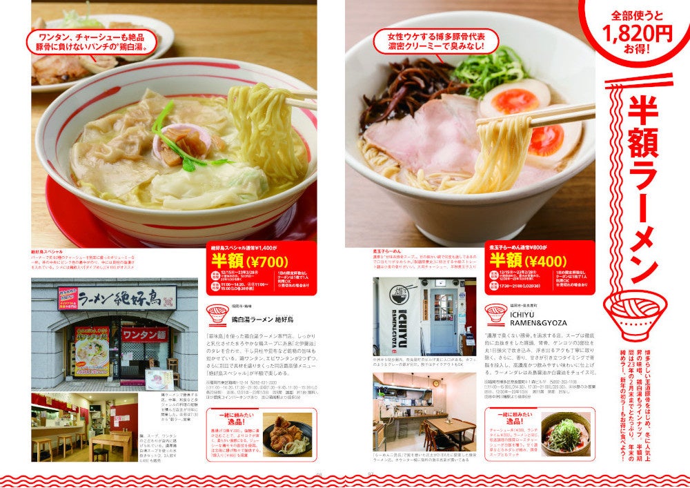 全部使うと、なんと1,820円相当も得しちゃう大奮発のクーポン企画です。 福岡の人気ラーメン店に直接交渉して、読者のみなさまがラーメン一杯半額になる特典をゲットしてきました!半額期間は2023年の2月まで。王道の豚骨をはじめ、味噌、鳥白湯もラインアップしています!