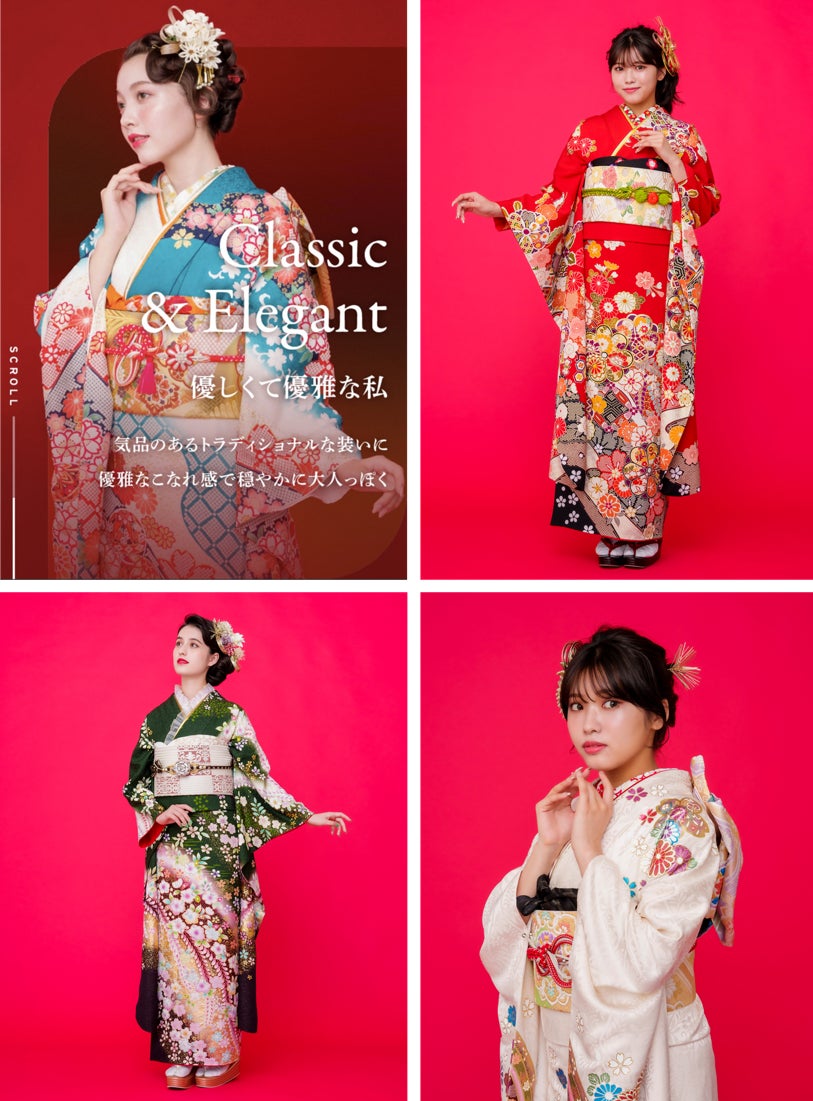 2023年冬の最新カタログでは、あらゆることが多様化する世の中において、「ナチュラル」、「クール」、「トレンド」、「キュート」、「フェミニン」、「レトロモダン」、「モード」、「クラシック」、「エレガント」の9つのテイストに合わせ、様々な柄やお色の振袖をご用意。創業53周年を迎える老舗振袖専門店の京都きもの友禅が誇る、スタンダードな古典柄を現代的に昇華したデザインの振袖をはじめとする幅広いラインナップで、“なりたいハタチ”の実現をサポート。さらに、コーディネートにアクセントを加える小物も多数展開。旬を取り入れた着こなしで新たな自分を発見できるかもしれません。