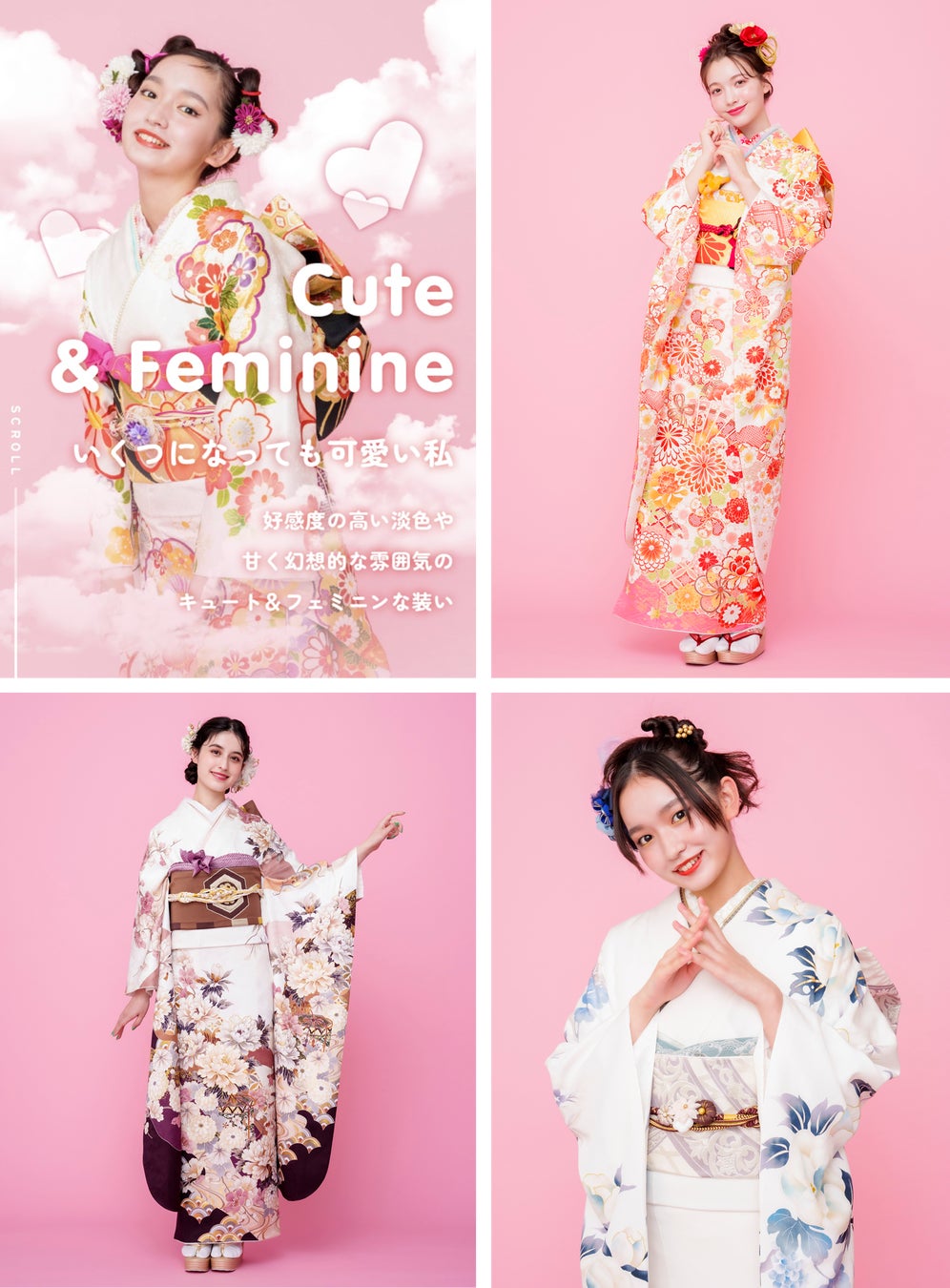 好感度の高い淡色や甘く幻想的な雰囲気を放つキュート&フェミニンな装いもご用意。パステルカラーはもちろん、濃紺やピンクベージュなどのカラーにも愛らしい花々が咲き誇り、小物使いによる上級者のキュートスタイルをご提案。ハタチという若々しさと無邪気さだけではなく、どこか大人の魅力も感じさせるフェミニンスタイルもトレンド。レースがアクセントとなった振袖など細部にわたり、可愛いを詰め込んだコーディネートにご注目。