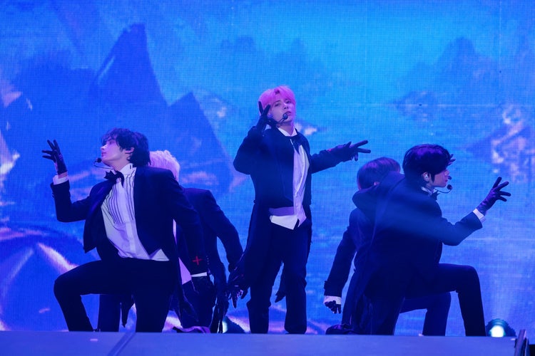 5組目のTOMORROW X TOGETHERは、ステージ下から勢いよく飛び出して登場。