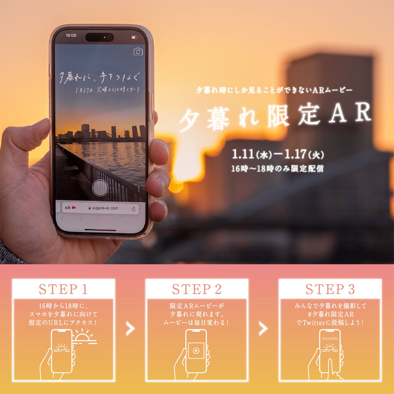 『夕暮れに、手をつなぐ』は、16時-18時限定で、夕暮れの空にスマホをかざすと、広瀬すずさんと永瀬廉さんからボイスメッセージ入りAR動画が届く「夕暮れ限定AR」を、番組公式Twitterアカウントより、1月11日(水)から17日(火)まで配信いたします。「夕暮れ」という昼でも夜でもない時間帯の「かけがえのなさ」を味わってもらうため、ボイスメッセージは期間中の指定時間にしか出現せず、メッセージは毎日違う内容を配信。 広瀬さん直筆の文字が空に浮かび上がる、特別な日も用意しています。