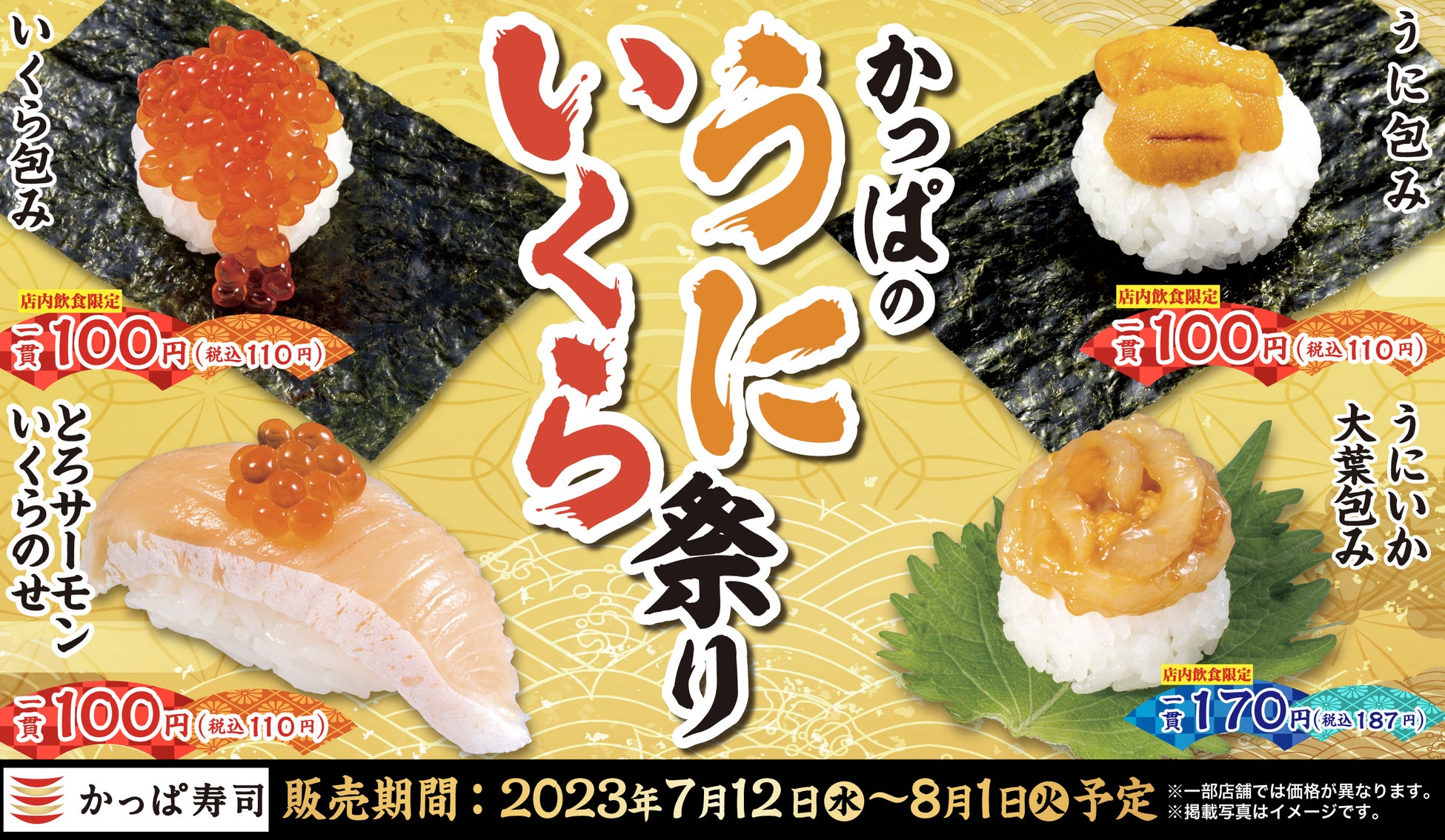 この夏、2023年7月12日(水)~8月1日(火)の期間は『うに包み』『いくら包み』をそれぞれ一貫110円(税込)店内飲食限定でご提供いたします。