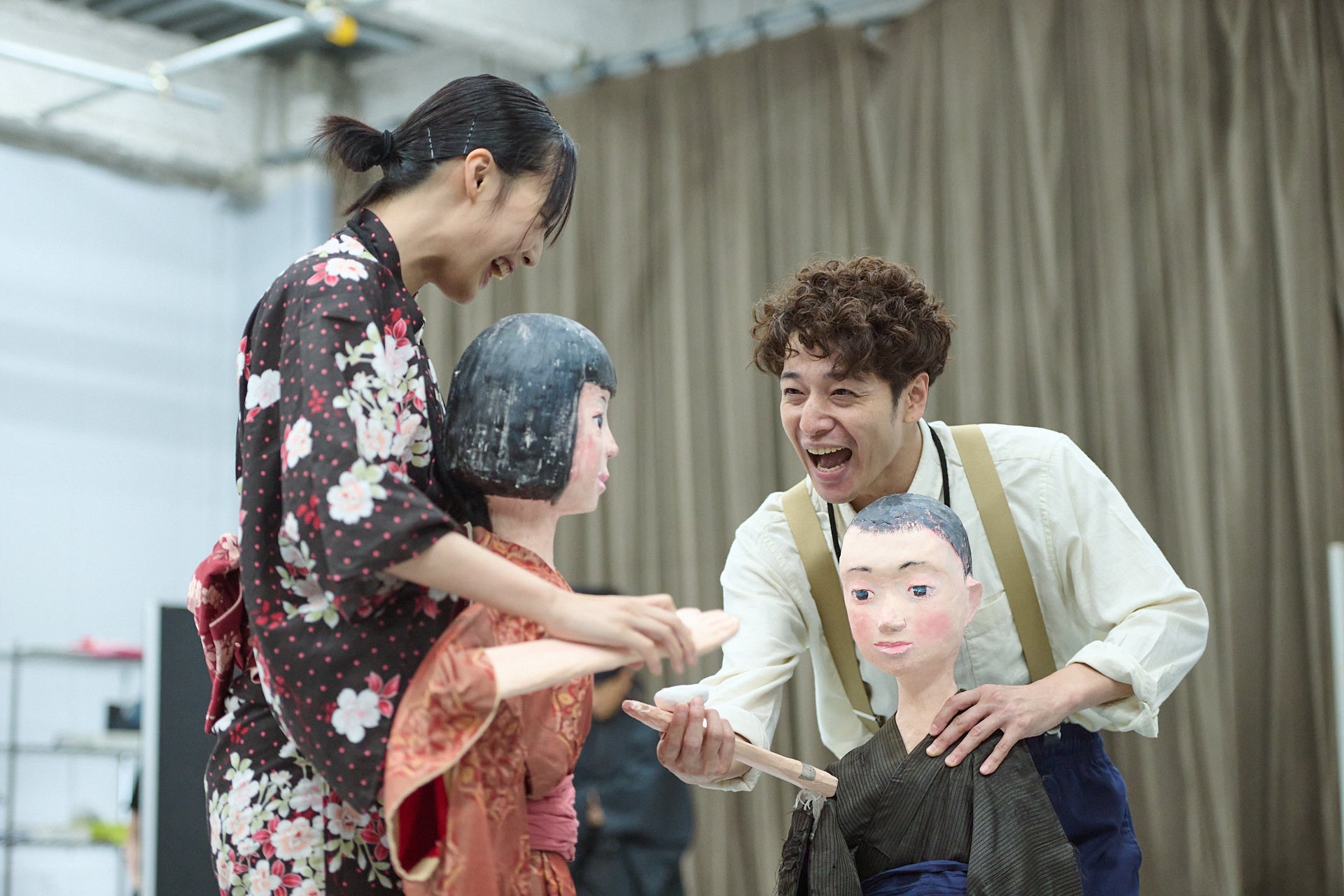 宮沢賢治が鉱石に興味を持ち始め“石っコ賢さん”と呼ばれていた幼少期から、親元を離れ盛岡中学校(現在の高校にあたる)に入学するまでの10分ほどのシーン。演出の青木が「映像であれば子供時代は子役が演じるのですが、せっかくの演劇なので、人形からスタートして大人の役者にスライドしていきます」と話したとおり、政次郎とイチの子供たち(賢治、トシ、清六)の幼少期は、それぞれの役者が人形を操りながら芝居をする。稽古は、その人形姿で川で拾った石を「牡蠣の化石だ!」と喜び、「波の音がしねが?」とトシ(駒井)に聞かせる賢治(福田)のシーンからスタート。波の音を「聞こえね」と言いながらも大好きな兄の言葉に導かれ想像を広げていくトシと、どこか未来の姿も連想させる賢治とのやり取りは、その目に映る広々とした世界を見せてくれる。そんなふたりに「賢治は質屋(宮沢家の家業)!トシは嫁!」と明治時代の生き方を説くのが政次郎(的場)だ。強面の的場が叱ると迫力が出そうなものだが、台詞のトーンや表情からどうにも隠し切れない愛情がにじみ出ていて柔らかい。その隣には赤ん坊の清六を抱いた妻・イチ(大空)がおり、政次郎とはまた違ったカタチの愛情がこぼれる。岩手弁も相まって、家族5人が醸し出す空気は温かで、お説教ですらいくらでも見ていたい気持ちにさせられるのが印象的だった。