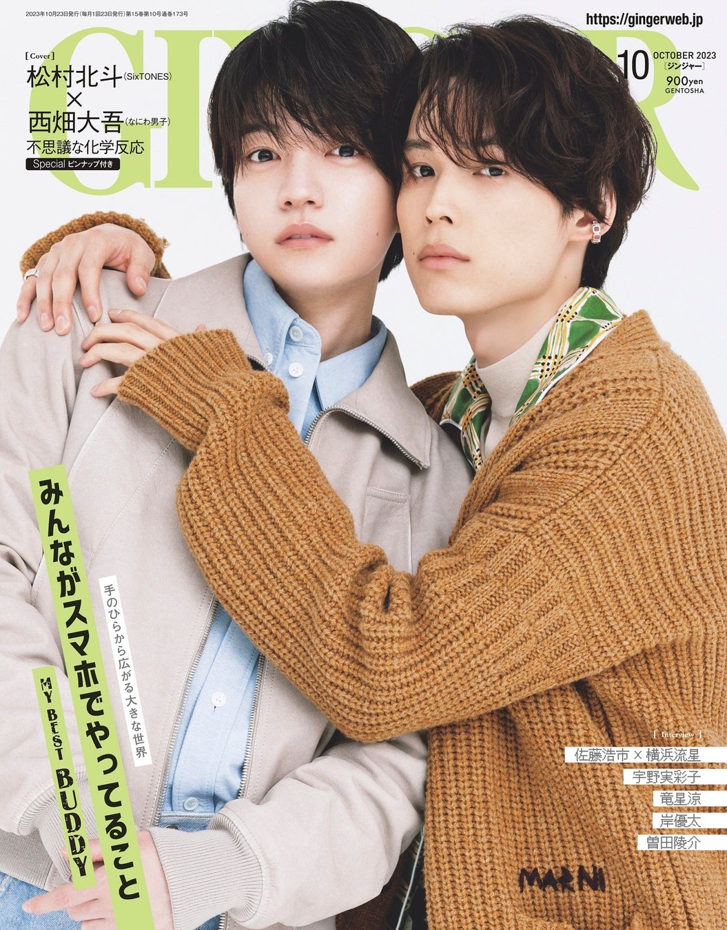 8月23日(水)全国発売のGINGER2023年10月号は、現在放映中の注目のドラマ「ノッキンオン・ロックドドア」でW主演を務めている松村北斗(SixTONES)と西畑大吾(なにわ男子)の次男コンビが、見目麗しいビジュアルで表紙を飾る!