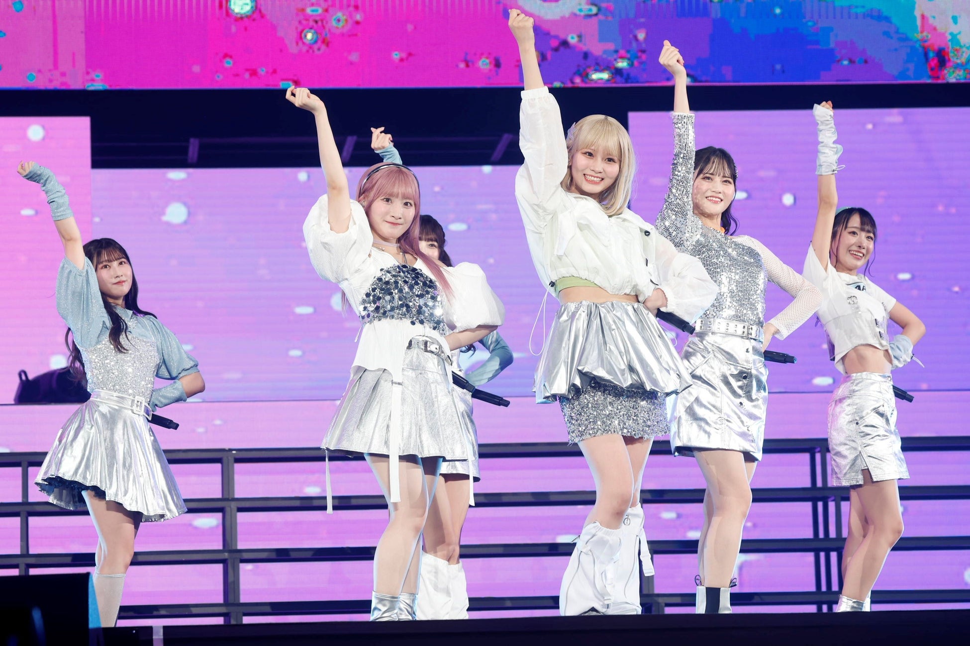 4曲目「Want you!Want you!」では、メンバー全員が乗る円形のセンターステージがゆっくりと上昇。ピンク色の華やかな新衣装が観客の目を引く中、360°全方位に向けて弾けるような歌とダンスが届けられた。ユニット曲のコーナーでは“いかりんぐ”の愛称でファンから親しまれ、高い歌唱力と表現力を誇る佐々木舞香と野口衣織の2人がお互いのソロ曲を交換するレアな展開に、客席から興奮と驚きの色が混じる声が響く。大人びた黒の衣装を身にまとった佐々木は歌謡曲調のナンバー「拝啓 貴方様」を、反対に純白の衣装に身を包んだ野口は片想いソング「真夜中マーメイド」を歌唱。それぞれ楽曲の色に合わせた情感のこもった歌声で観客を魅了した。