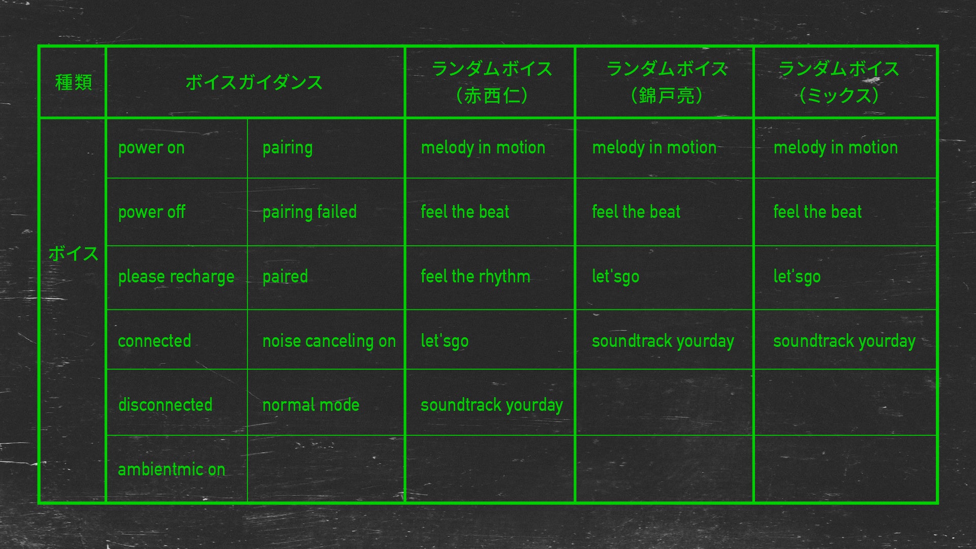 さらに新たな機能として、イヤホンのボタン長押しでランダムに再生される「ランダムボイス機能」を搭載。“melody in motion“などのランダムボイスのセリフは、「みなさんにもっと音楽を楽しんでほしい」という想いのもと、二人にご提案いただきました。