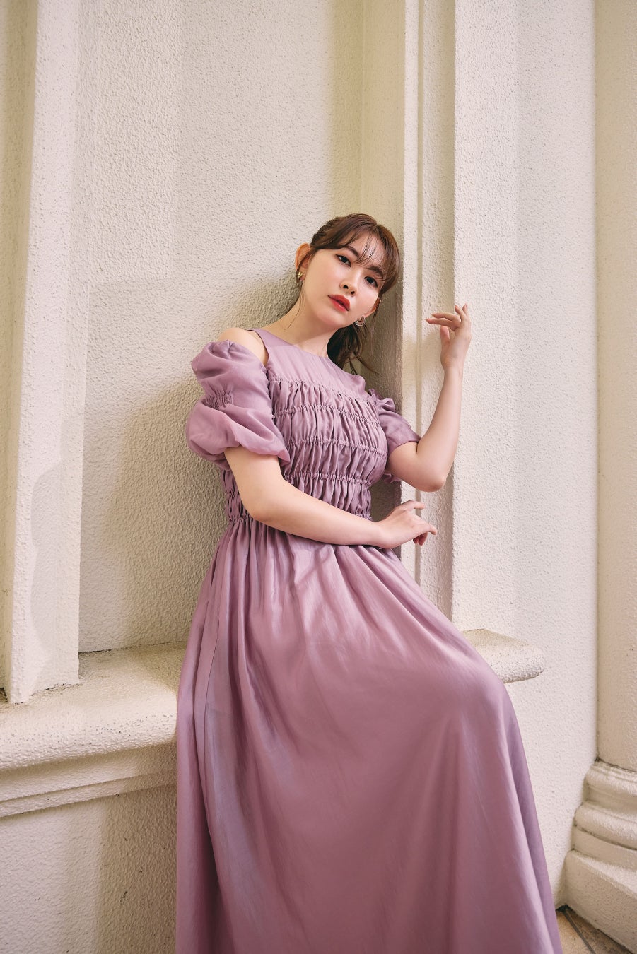 キービジュアルとなるエレガントなホワイトドレスは、デザインレースとたっぷりのギャザーを施し、裾に向かって広がるシルエットが優美な一着。