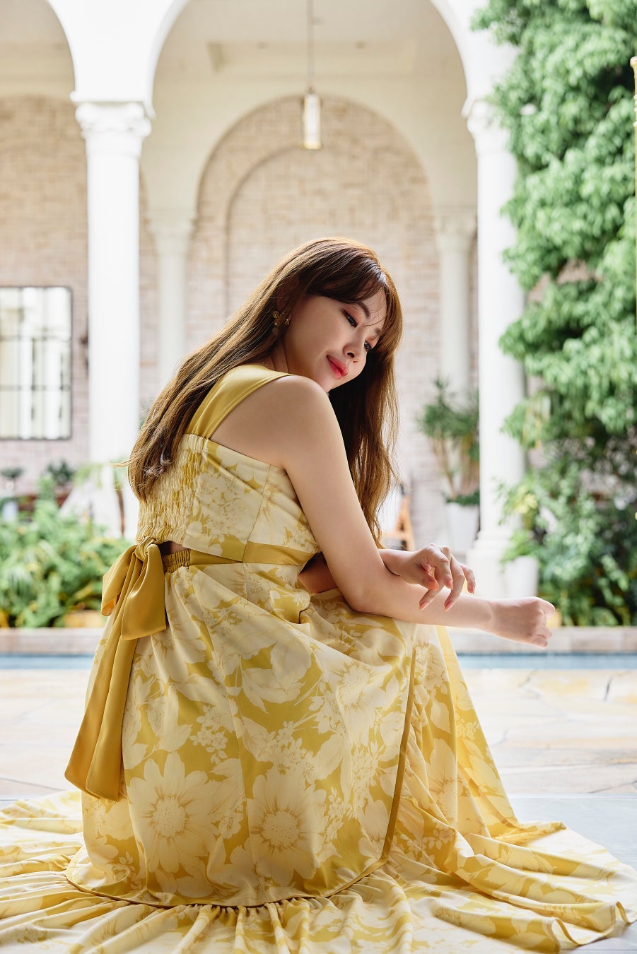 夏の日差しに着映えするレモンカラーのフローラルドレスは、上品な微光沢のある生地との配色がリュクスな印象に。