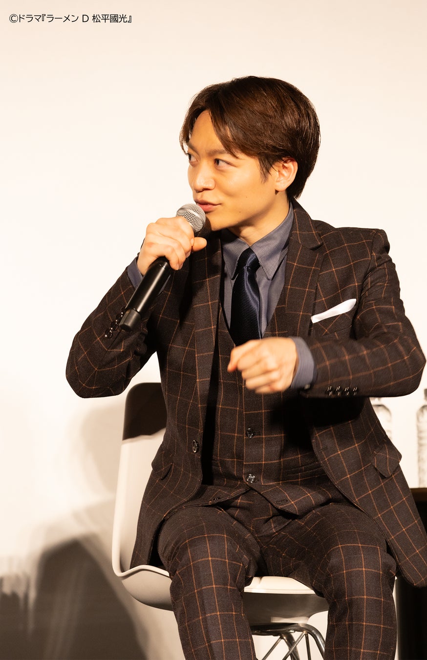 「このドラマの魅力は、僕たちが演じるドラマのシーンと本当にラーメンを取材しているテレビ番組のシーンと二つあるので、また新しい楽しみ方ができるドラマなんじゃないかなと思っております。ぜひ見てください。」