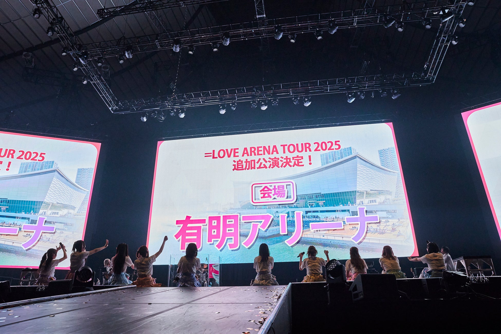 ここまで充実のライブを展開してきた=LOVEだが、アンコールからは生バンドをバックにしたパフォーマンスを披露し、観客の満足度をより一層高めていく。『恋人以上、好き未満』『ナツマトペ』『夏祭り恋慕う』など5曲が躍動感と迫力をたたえて届けられた。会場の盛り上がりが加速していく中、その後のMCでは=LOVE ARENA TOUR 2025「~Timeless Tales~」が完売した公演も出る大盛況のツアーとなったことを受け、7月12日、13日に東京都・有明アリーナで追加公演が行われることが明らかに。そしてラストナンバーとして『探せ ダイヤモンドリリー』が披露されると、場内のボルテージが最高潮に達した。