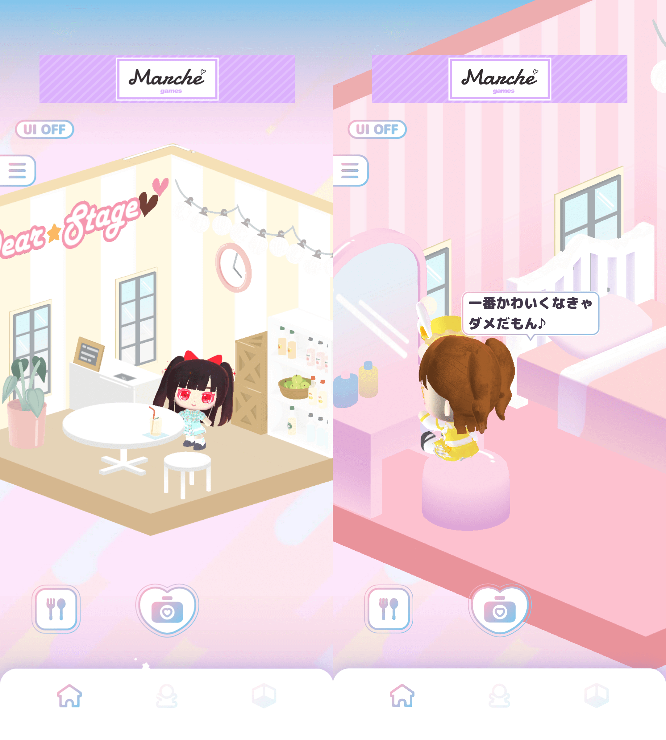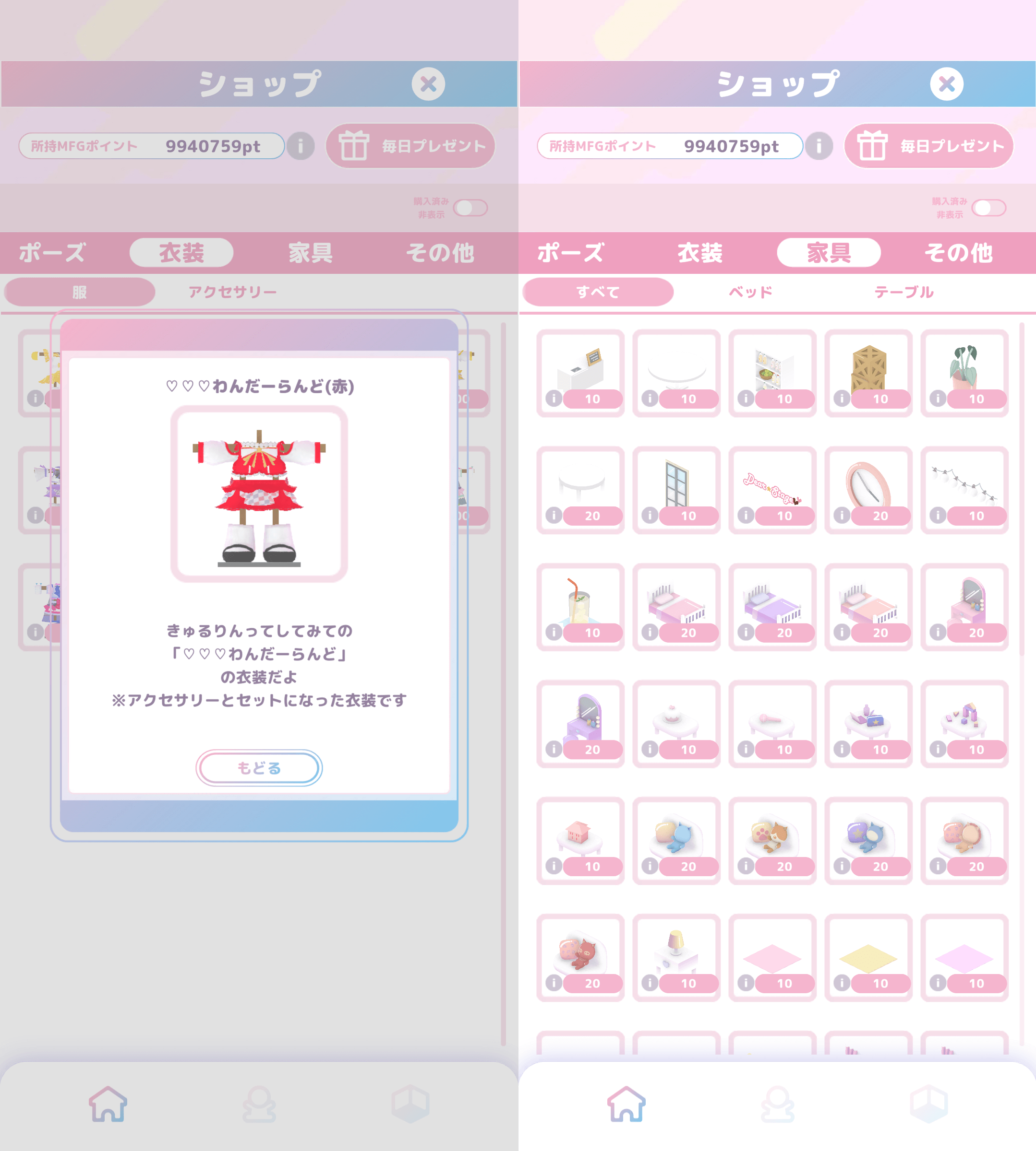 アプリ内ショップでは、マーケットプレイス『Marche for games(MFG)』のポイントを利用して、新しい衣装や家具と交換が可能です。
