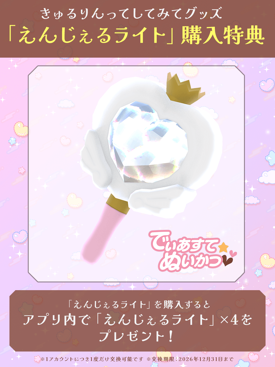 『きゅるりんってしてみて』の公式ペンライトに封入されたARコードをアプリで読み取ると、アプリ内のぬいに持たせることができる「限定ペンライト」が付与されます。