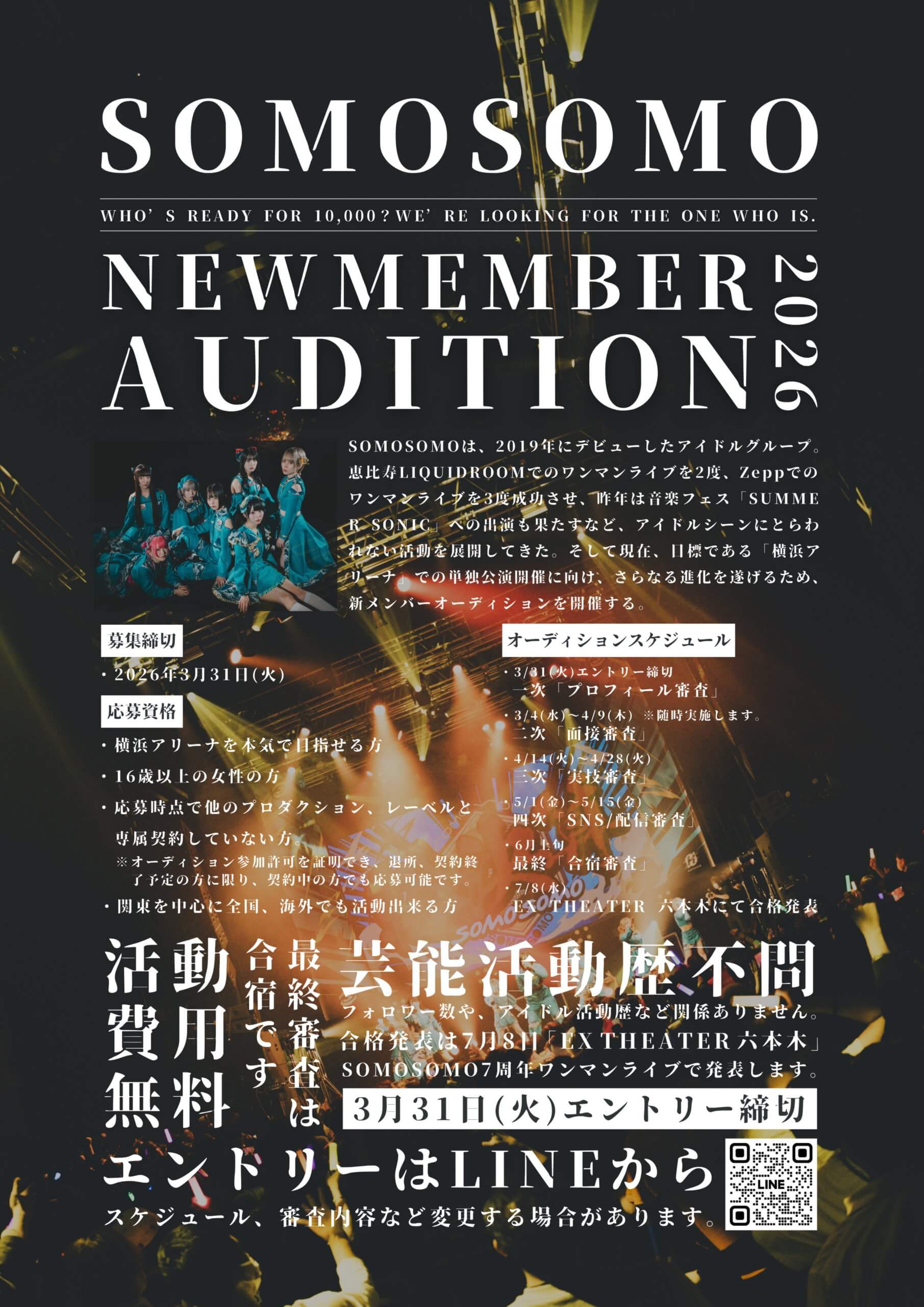 兼ねてよりグループの目標として掲げている横浜アリーナやその先のステージに歩みを進めるべく、”SOMOSOMO 第3章”を共に戦い抜く新メンバーを募集。