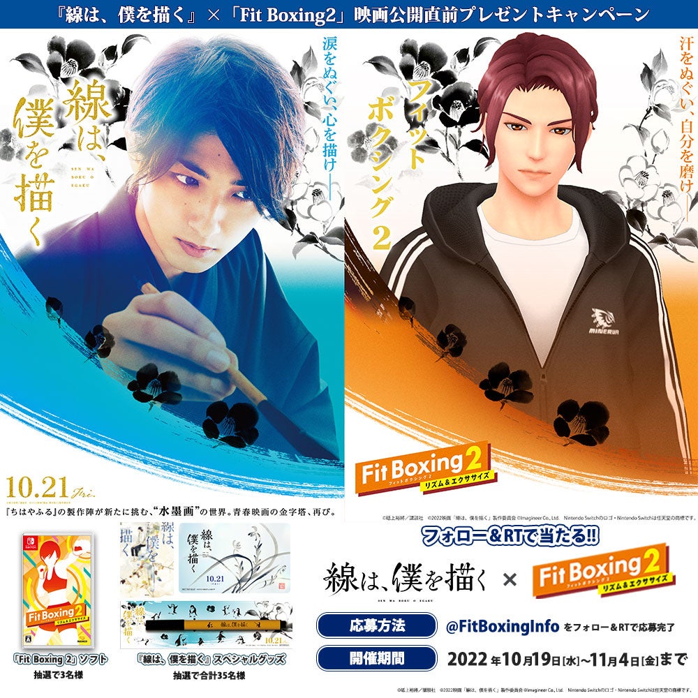 Fit Boxing公式Twitterアカウントをフォローし、該当の投稿をリツイートした方の中から抽選で映画『線は、僕を描く』オリジナルグッズやNintendo Switchソフト「Fit Boxing 2」をプレゼントします。詳細はFit Boxing公式Twitterアカウントにてご確認ください。
