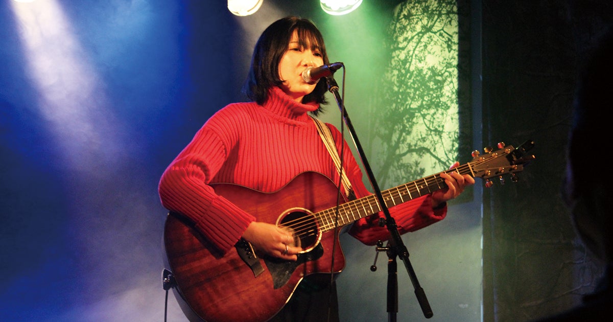 トップバッターを務めたのは、去年の6月に開催された本イベントのVol.3に登場したまび江。オープニングは「こんなんでいいのかな」から「友達はプレイリストの中」と2曲を披露。小柄な外見から想像がつかないほど力強い歌声で会場を魅了する。3曲目はイベントに再び出演した喜びと上京した当時の話を語り、サビのフレーズが耳に残るサマーソング「スイカセンス」。その後、バラードナンバー「ハイカブリヒメ」を歌い上げ、MCを挟んでラストナンバーの「ヨルヲ」を熱唱し、最高のパフォーマンスで締めくくった。