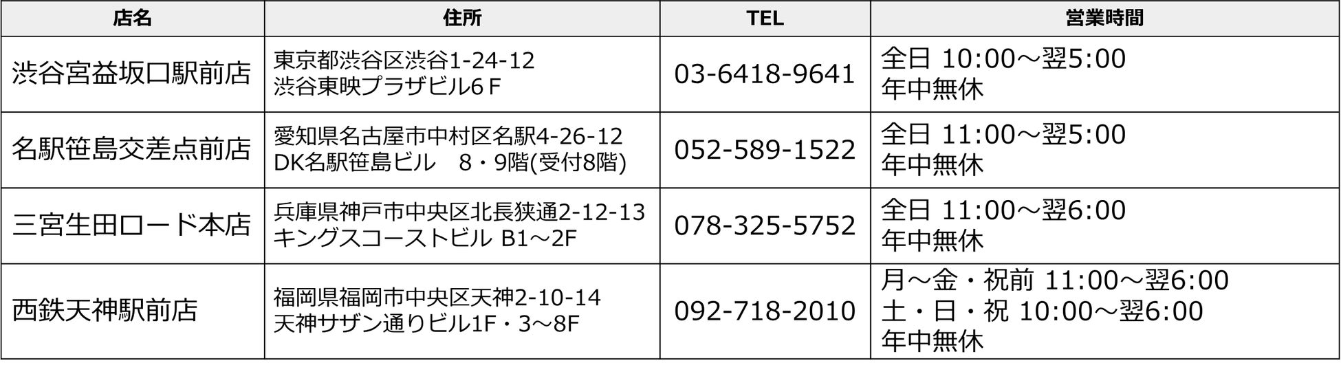 (コラボルーム実施店舗4店/麻生店/仙台駅前店/TXGAおおたかの森店/大宮南銀通り店/立川南口駅前店/新横浜駅前店/新潟駅前店 /静岡南口駅前店/梅田茶屋町本店/広島本店/松山衣山店)