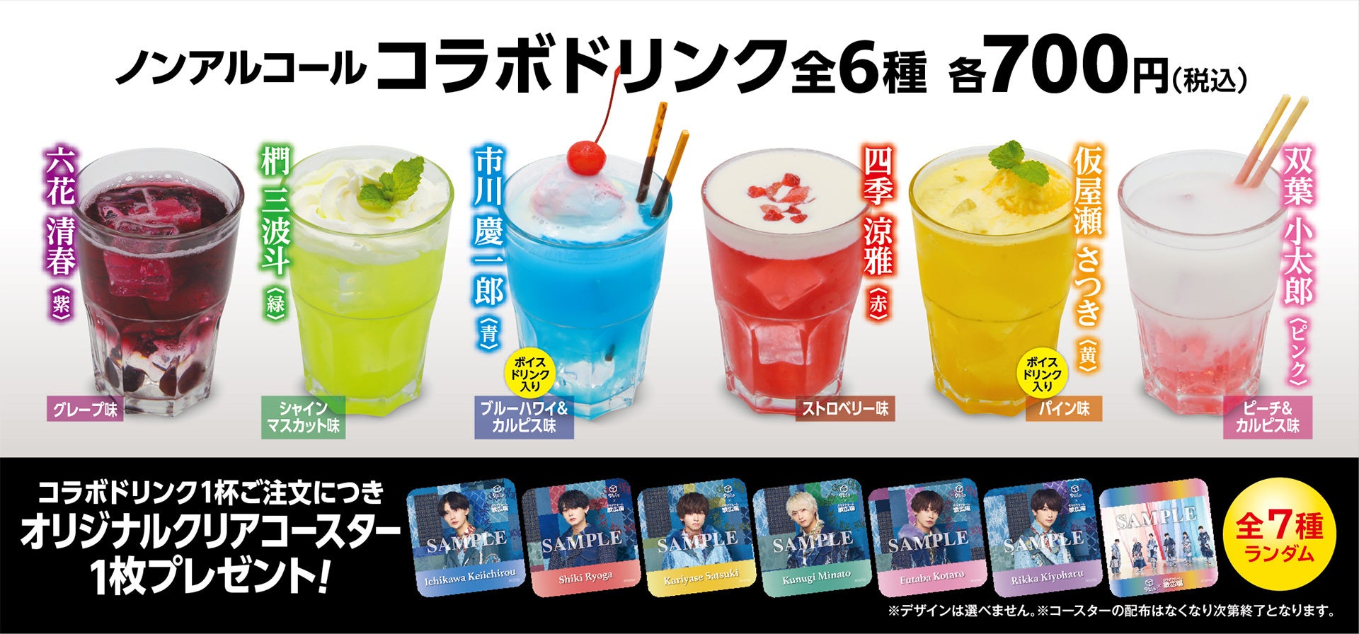 キャンペーン期間中、メンバ―カラーをあしらったコラボレーションドリンクを3店舗限定で販売します。コラボレーションドリンクをご注文いただいた方にはオリジナルクリアコースターを1杯につき1枚プレゼント。
