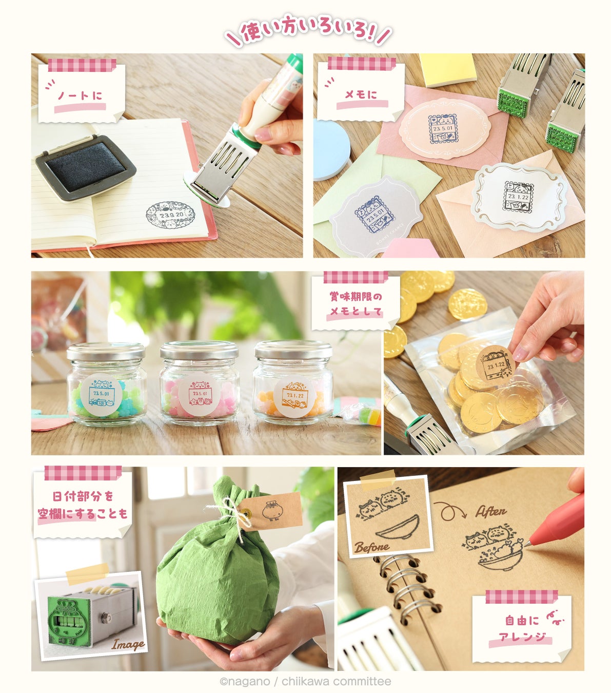 日記やメモやノートに押すことで可愛らしくデコレーションできる。他にもシールのラベルなどに押して封かんシールにしたり、賞味期限メモなどにもご活用いただけます。日付部分を空欄にしてご使用いただくことで、空欄部分にメッセージを書き込むなどアレンジも可能!