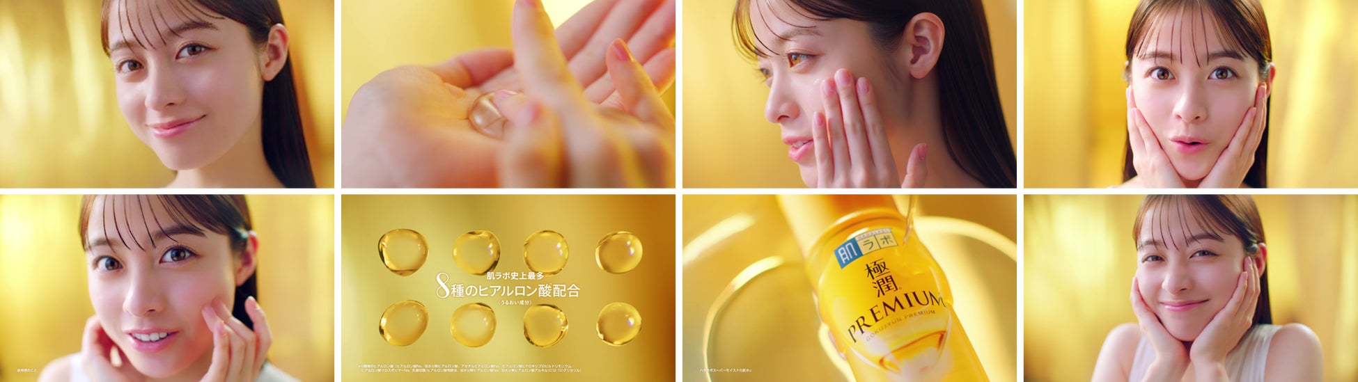 「多幸感」がテーマの新TVCMは、商品カラーの黄金色の空間で、橋本環奈が「肌ラボ 極潤プレミアムシリーズ」を初めて使う様子を撮影し、リアルなリアクションにフォーカスした内容となっている。化粧水を手のひらに出し、肌に乗せ、なじませた瞬間の驚き感動する表情や、肌のうるおいや感触にうっとり満足する表情など、橋本が見せる幸福感のある表情が印象的なCMとなった。
