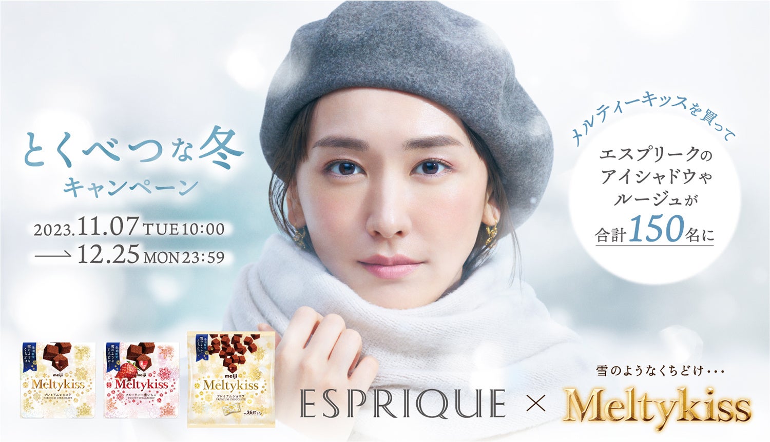 今回のグラフィックは、「しあわせが、ふってきた。」をキャッチフレーズに、雪とともに降ってくるメルティーキッスを手のひらで受けとめるキービジュアルが完成。今年は、白を基調としたコーディネートに、グレーのベレー帽をワンポイントとして、ちょっぴり大人なスタイリングとなっています。