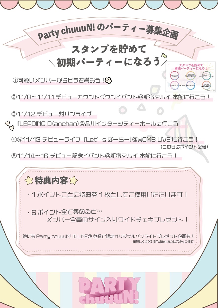 11月12日(日)に品川インターシティーホールにて開催されるデビュー対バンライブ『LEADING D (anchan)』、11月13日(月)WOMB LIVEにて開催される「Party chuuuN!」デビューライブ『Let`sぱーちー』の参加など、スタンプラリー用紙に記載された条件をクリアすると1ポイントプレゼント。貯まったポイントは特典会(チェキ会)で使える特典券と交換できるほか、6ポイント貯まるとメンバー全員のサイン入りワイドチェキをプレゼントいたします!