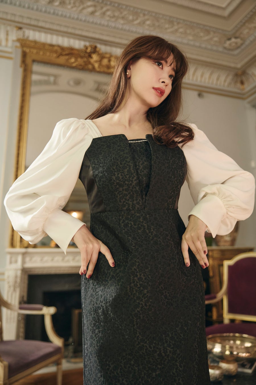 メインビジュアルになっているエレガントなファーが印象的なニットドレスは、女性らしい魅力を引き出し、シーンによって表情を変えて素敵な場所へと導きます。